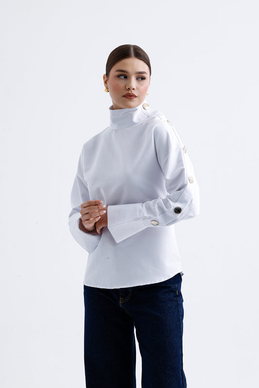 Kadın Beyaz Gömlek – Omuz ve Kol Düğme Detaylı Şık Stil