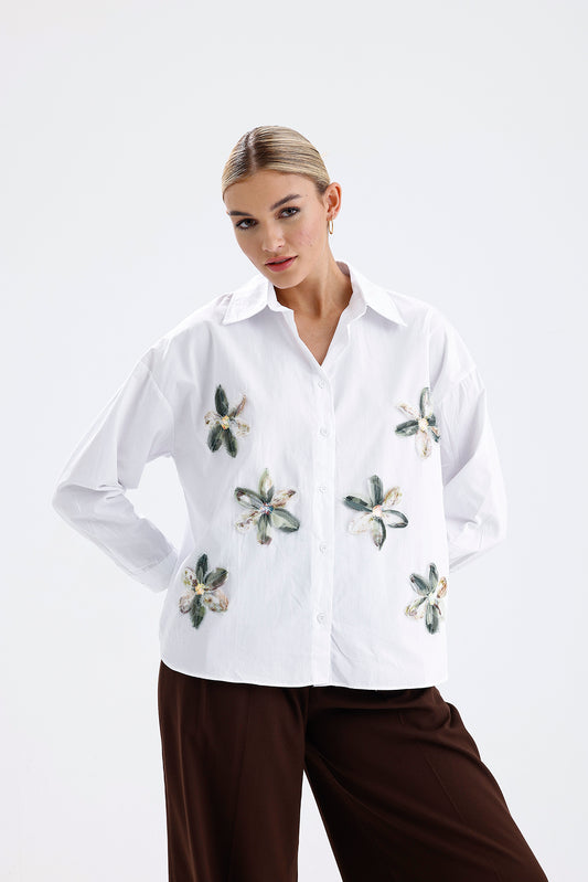 Kadın Beyaz Gömlek – Çiçek İşlemeli Rahat Şık Stil
