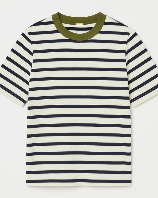 %100 Pamuk Kadın Çizgili Tişört – Yeşil Yakalı Rahat ve Şık Günlük Giyim