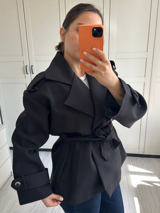 23% İndirimSiyah Çizgili Keten Takım – Kemerli Rahat Stil