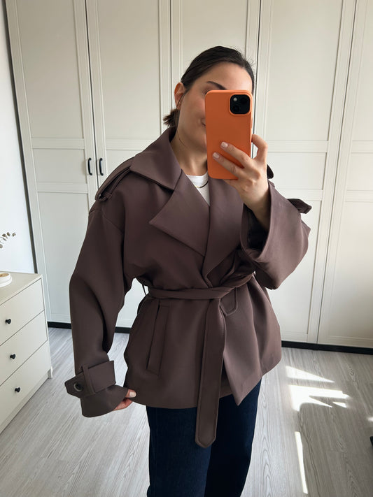 Kahverengi Çizgili Keten Takım – Kemerli Rahat Stil