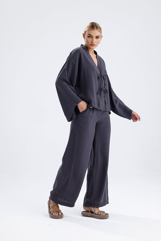 Kadın Modal Kimono Takım – Antrasit Renk Dökümlü İkili Set