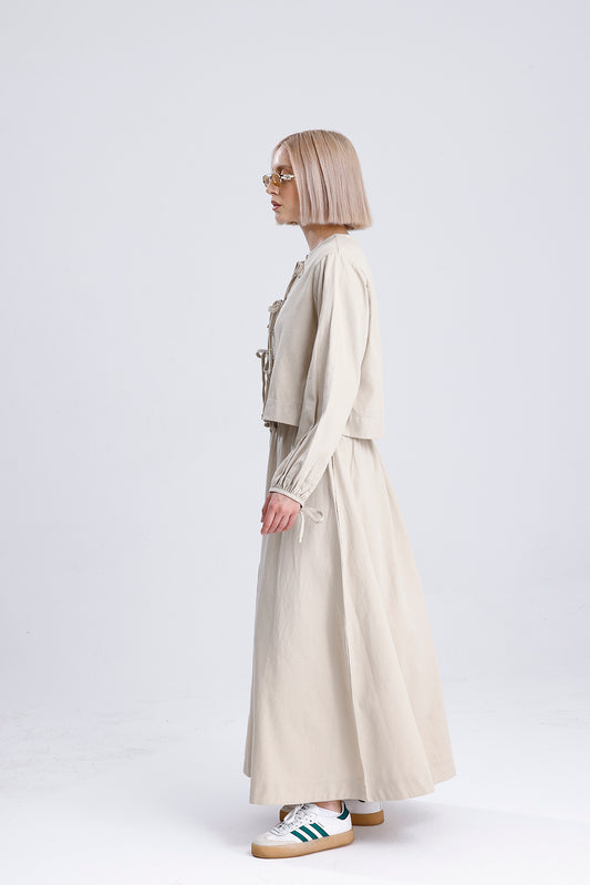 Kadın Kimonolu Etekli Takım – Bej Renk Şık ve Rahat İkili Set