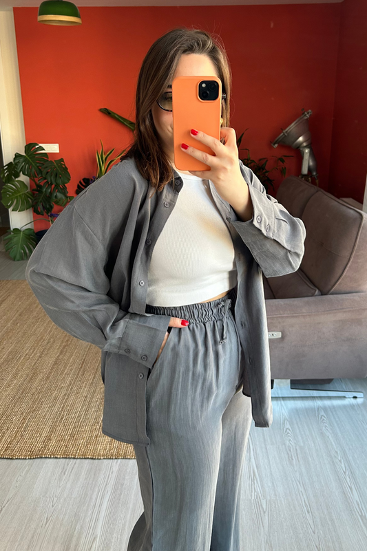 Kadın Gömlekli Modal Takım – Gri Renk Dökümlü İkili Set