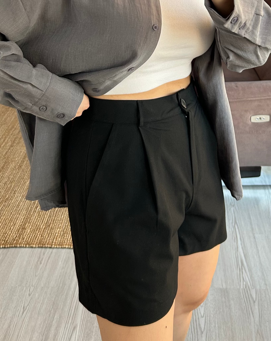 35% İndirimSiyah Kumaş Şort | Yüksek Bel Pileli Model