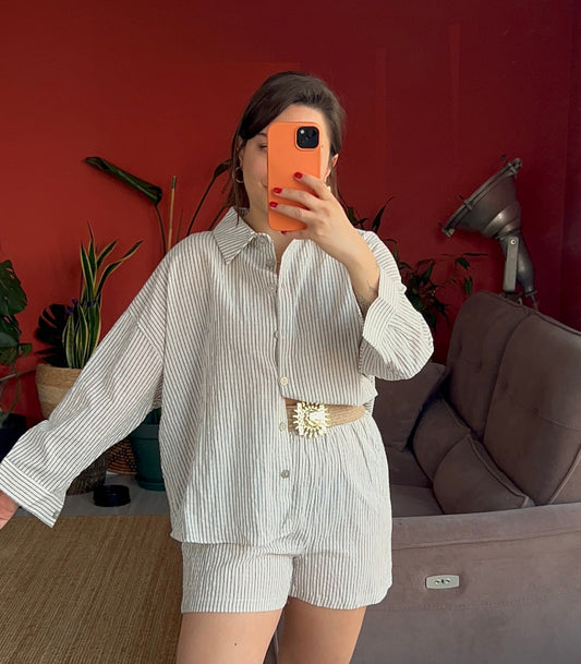23% İndirimSiyah Çizgili Keten Takım – Kemerli Rahat Stil