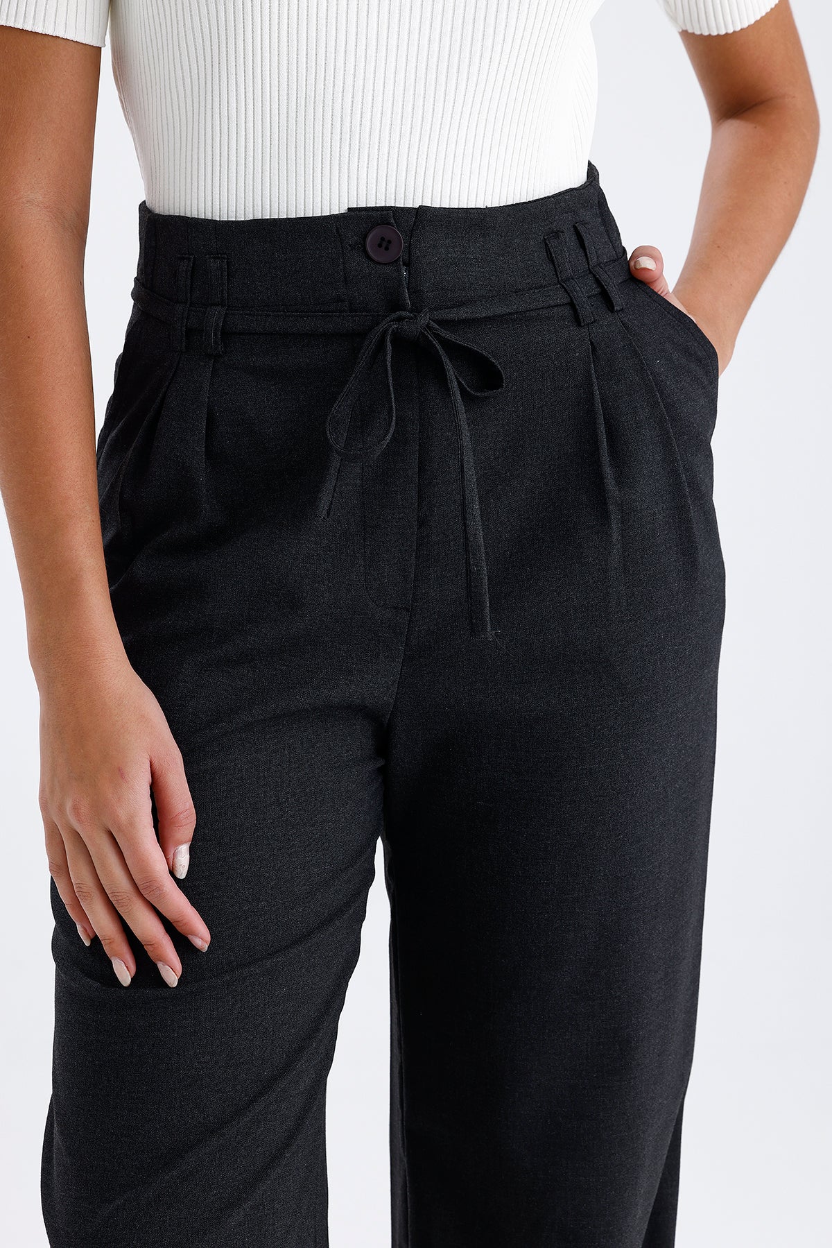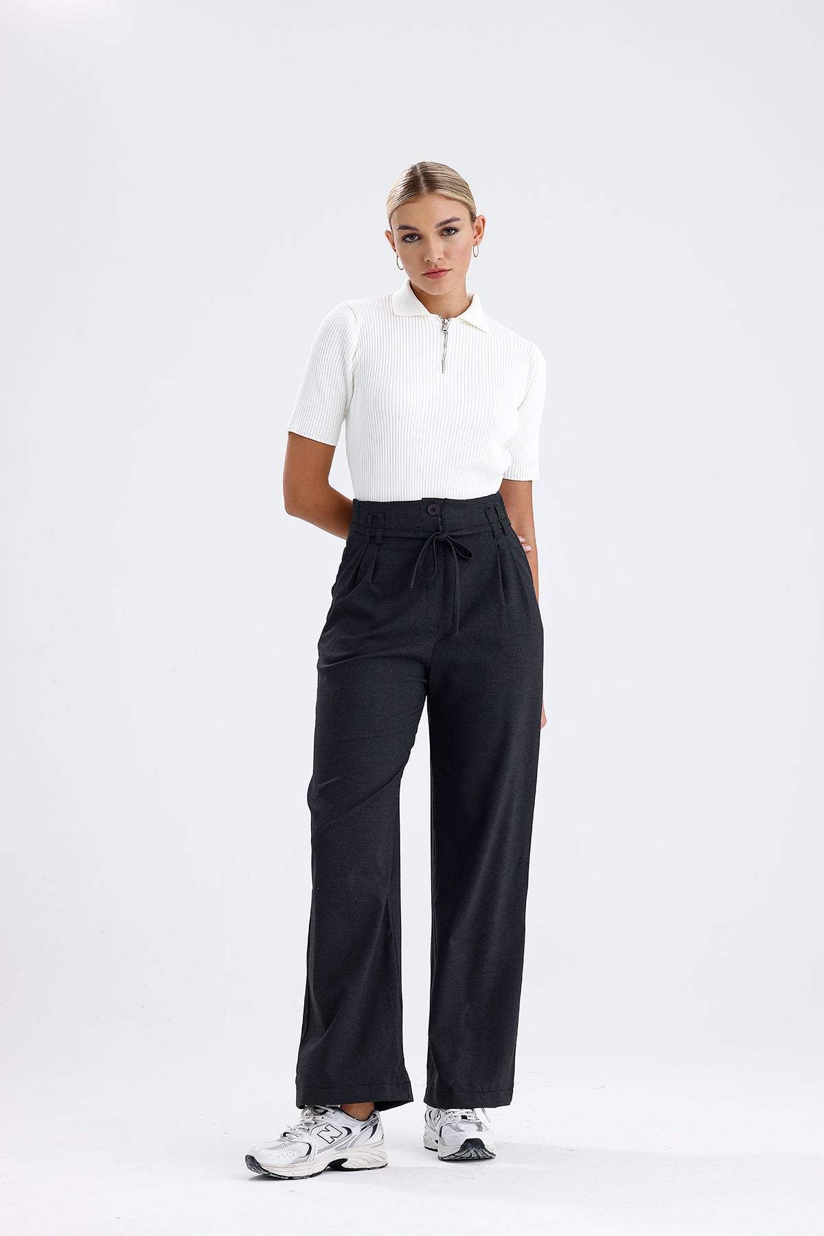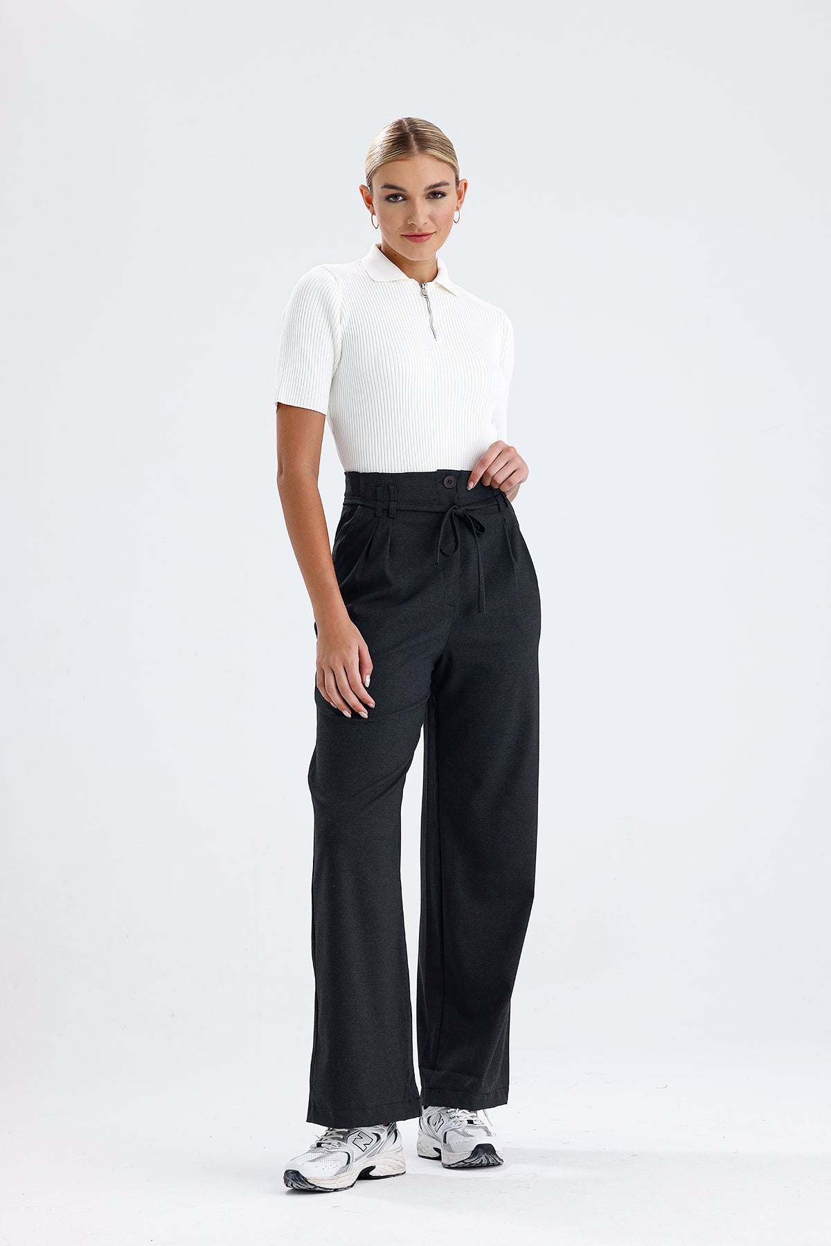 Kadın Kumaş Pantolon – Antrasit Bağlama Detaylı Rahat Kesim