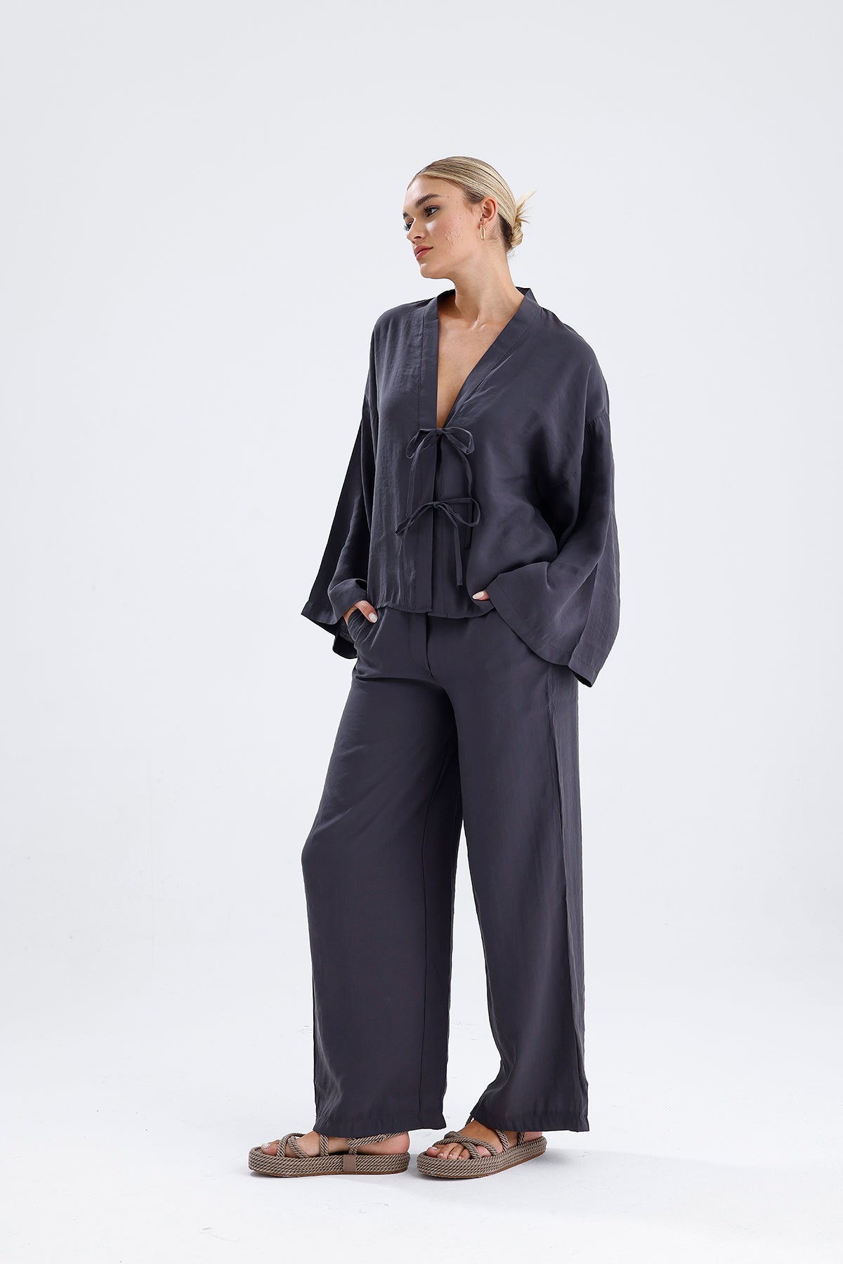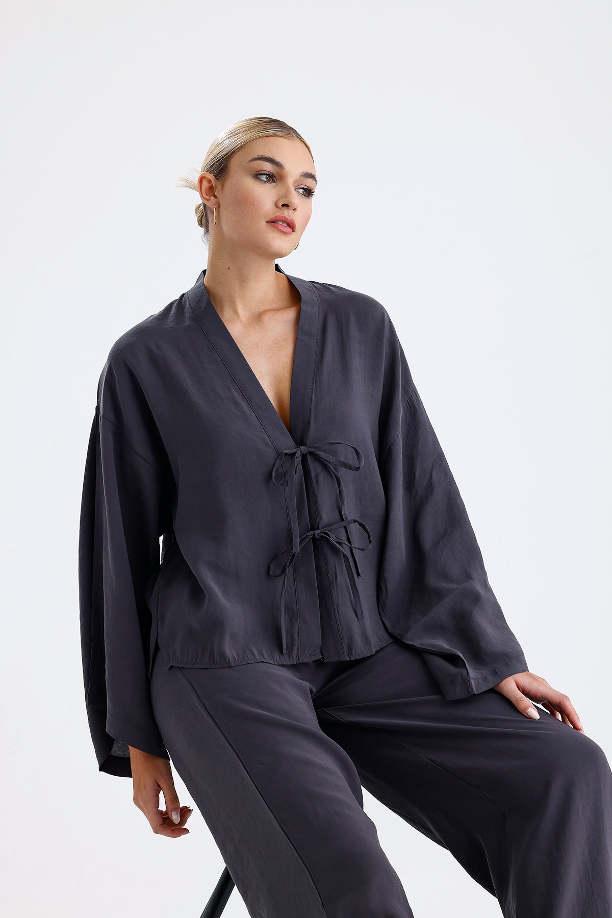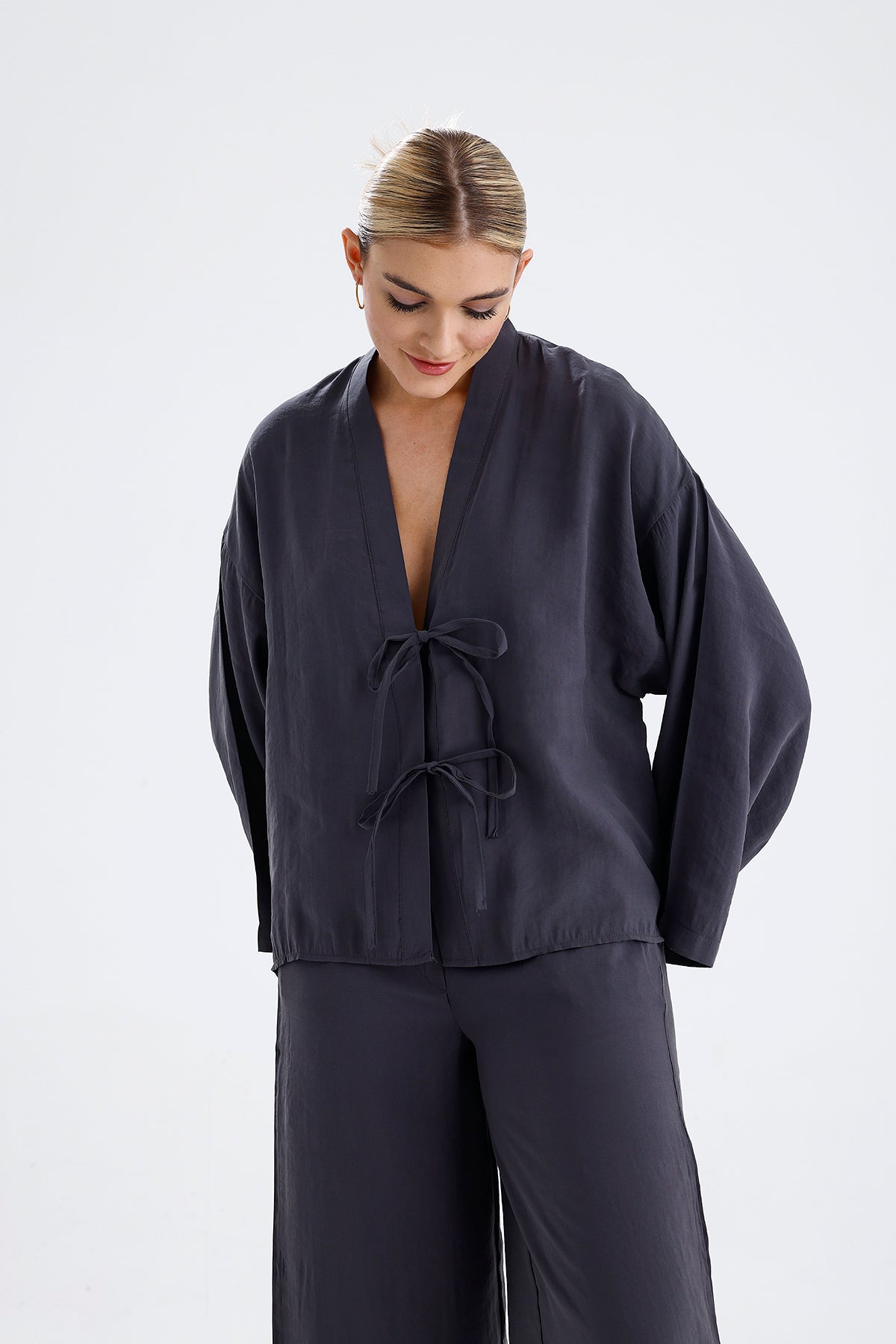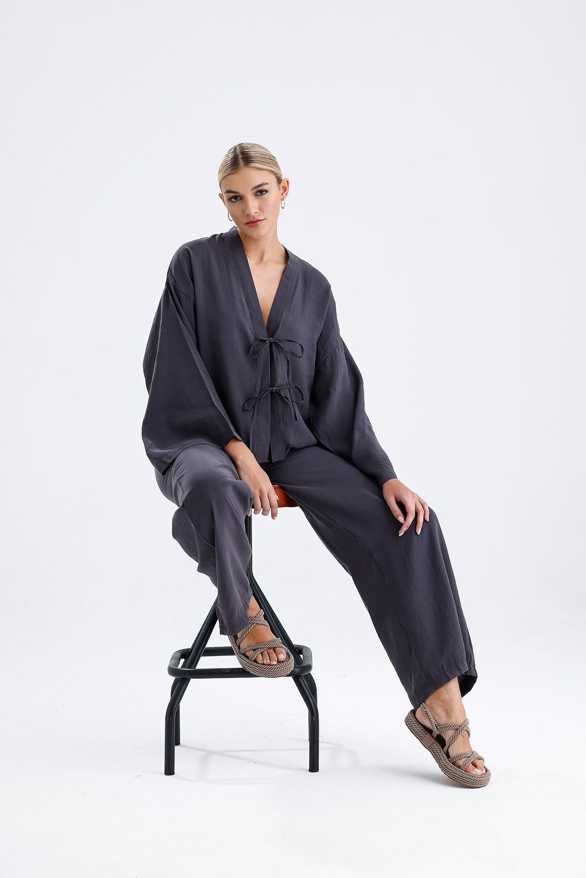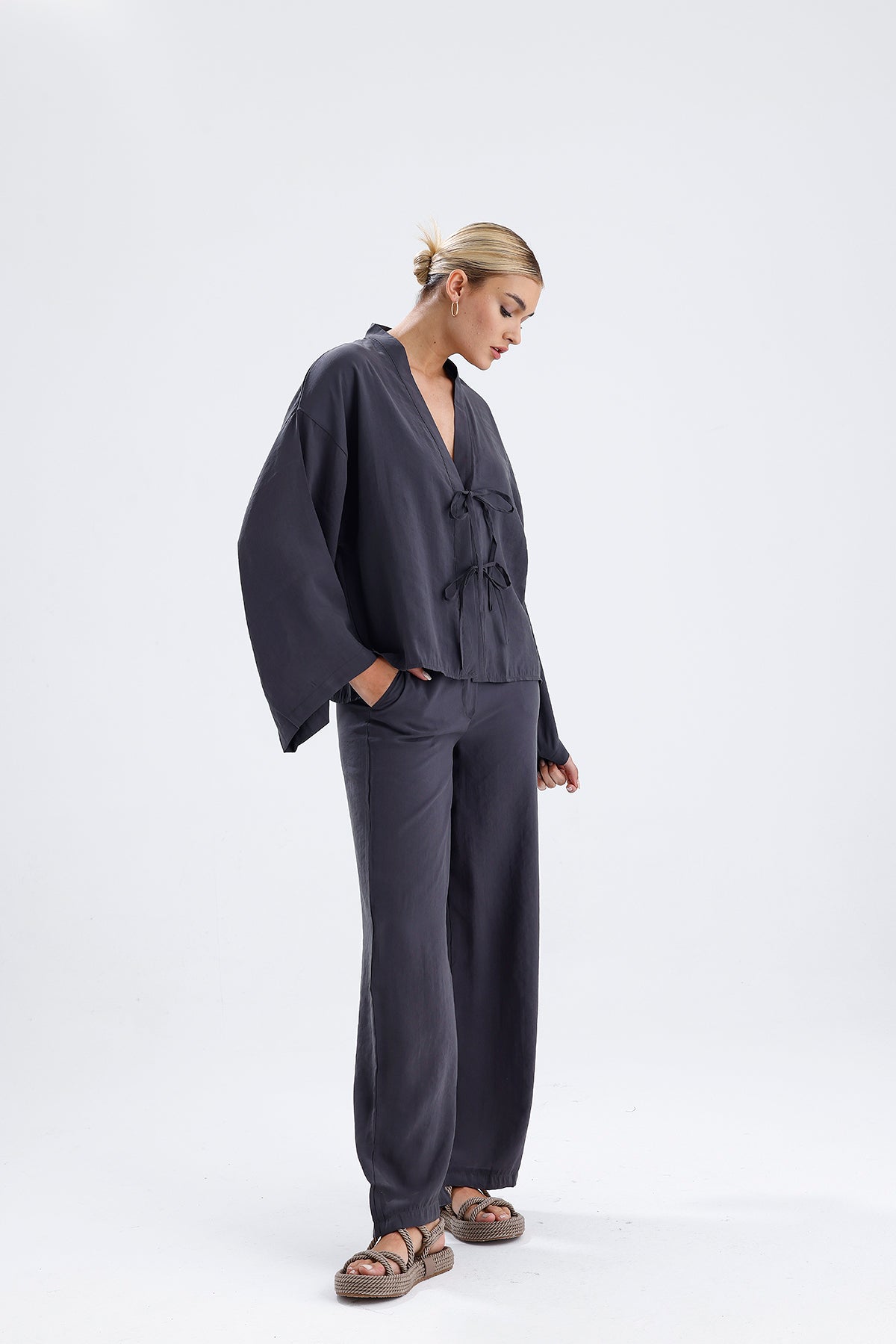 Kadın Modal Kimono Takım – Antrasit Renk Dökümlü İkili Set