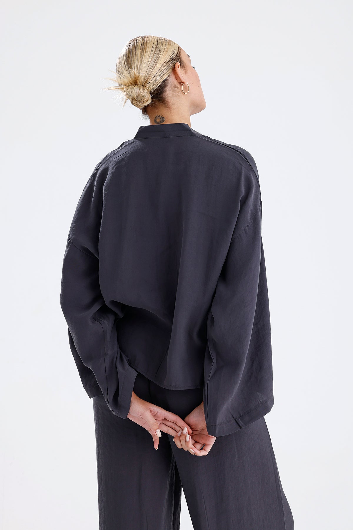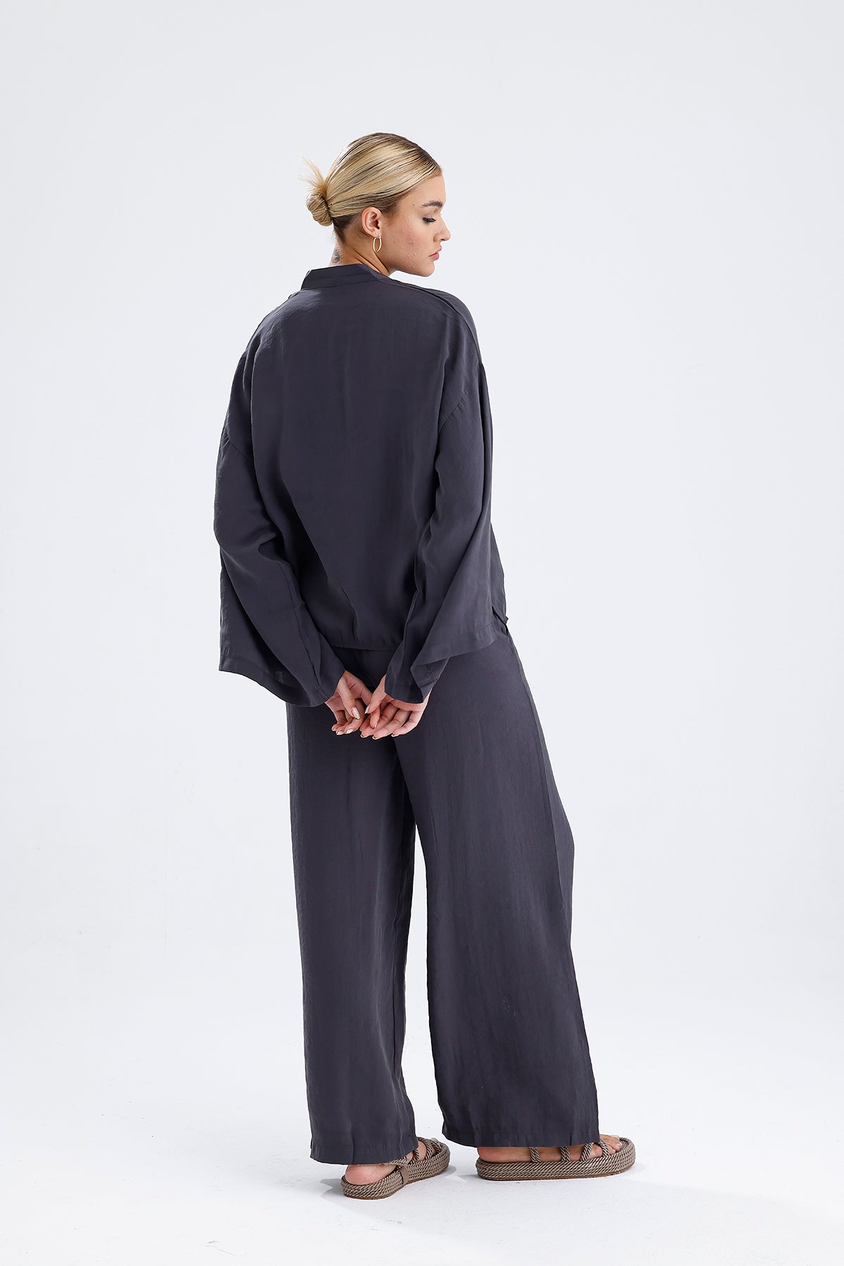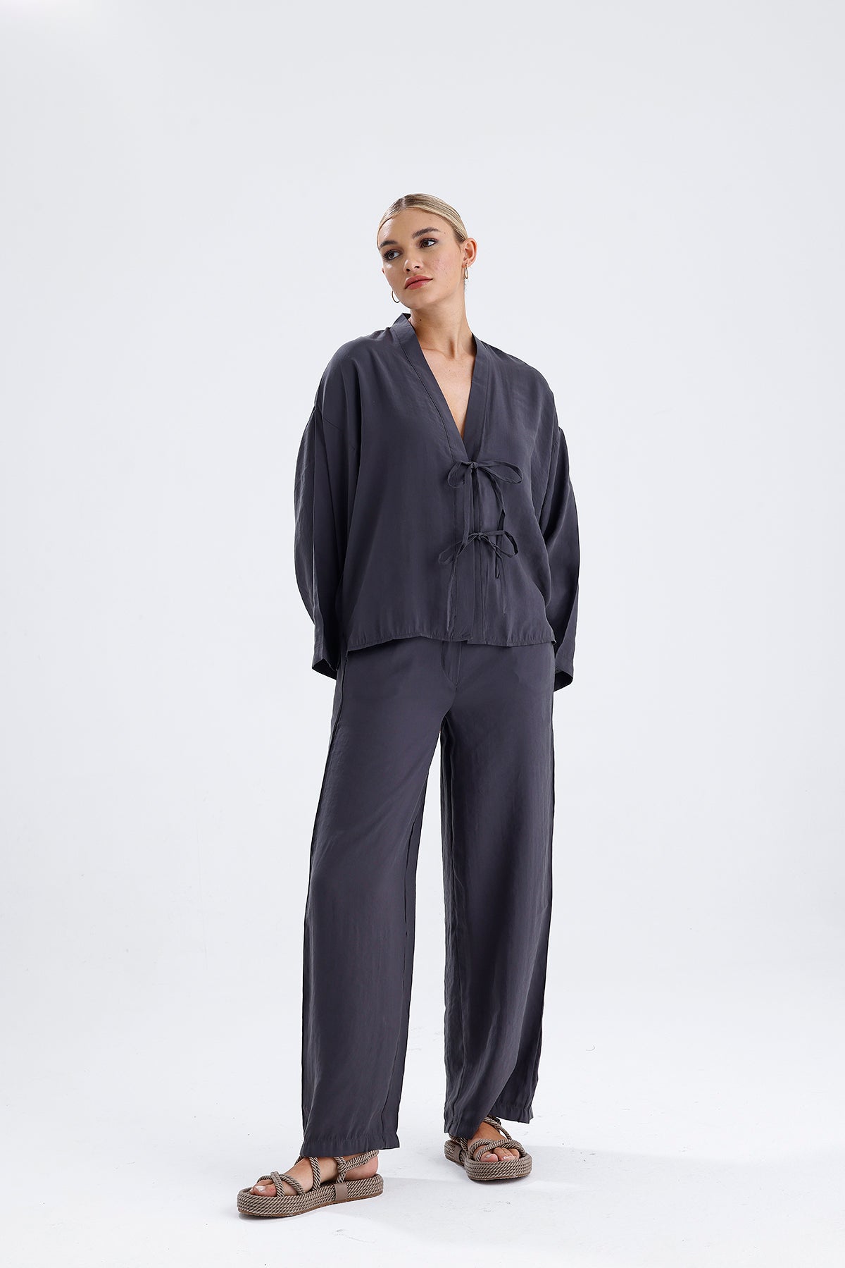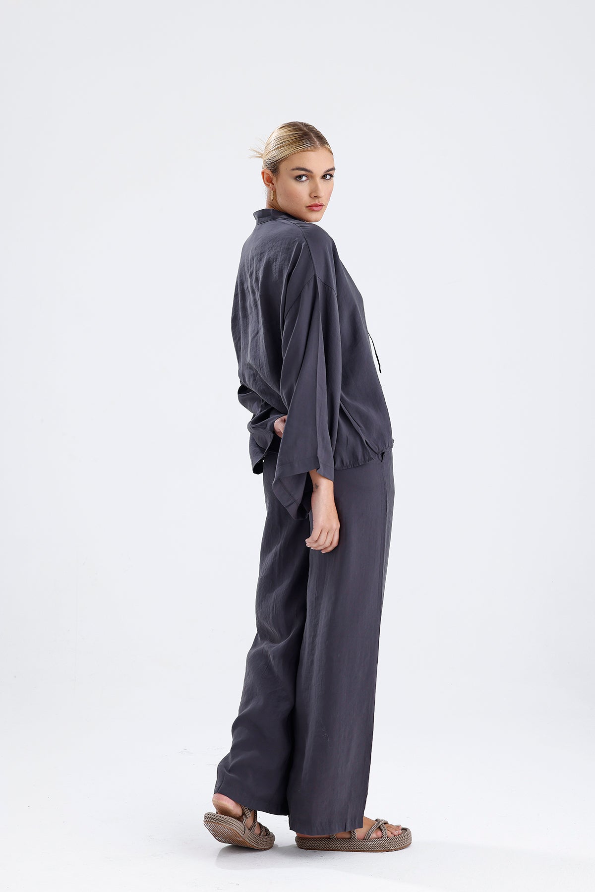 Yumuşak modal kumaşı ve dökümlü yapısıyla öne çıkan bu antrasit kimono takım, sade şıklığı ve konforu bir arada sunar. Üst kısmındaki kimono formu ile modern bir görünüm sağlar, günlük şehir stilinden ofise kadar çok yönlü bir kullanıma uygundur.