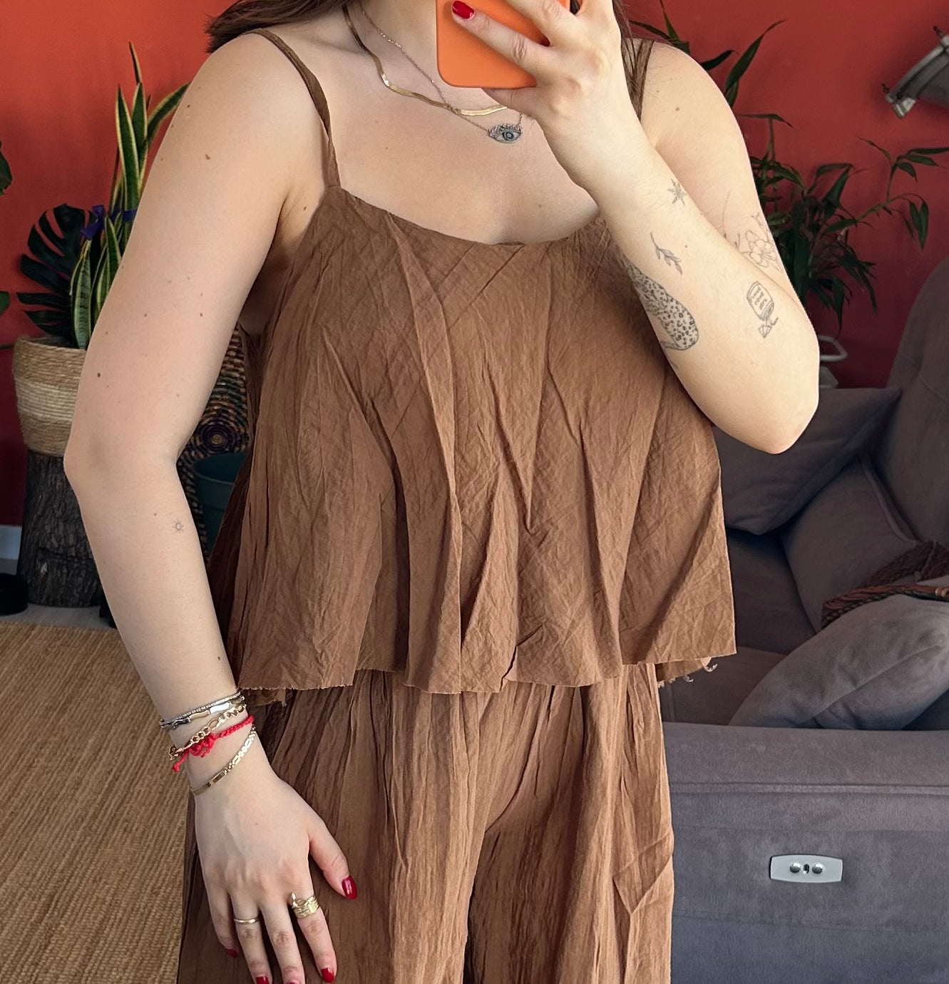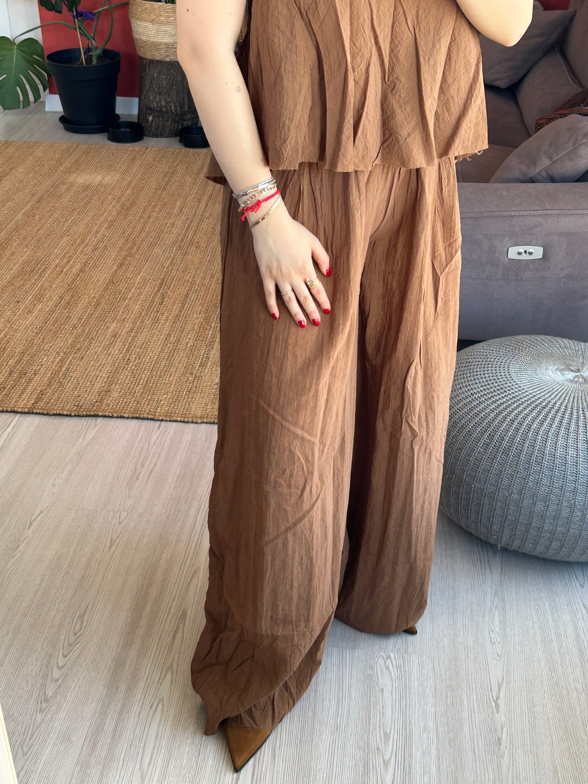 Hafif ve dökümlü modal kumaştan üretilen bu takım, modern şehir stiline uyum sağlayan şık ve rahat bir seçenektir. Gömlek gibi kullanılan üst parçası ve bol kesim altıyla hem ofiste hem günlük hayatta stilinizi konforla tamamlar.