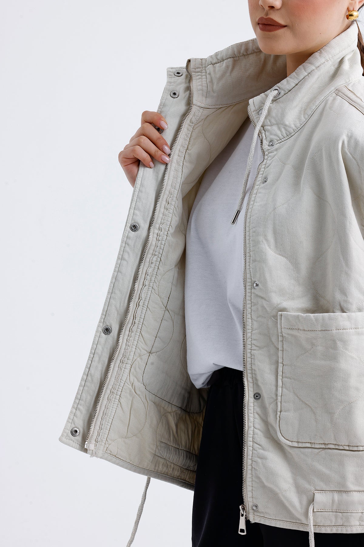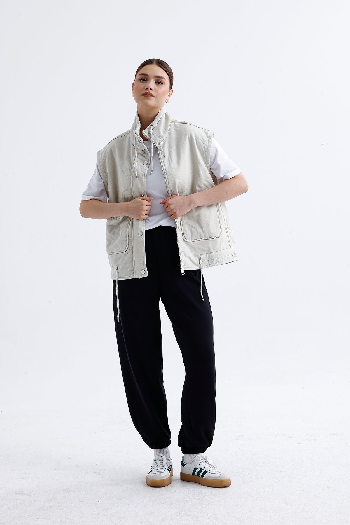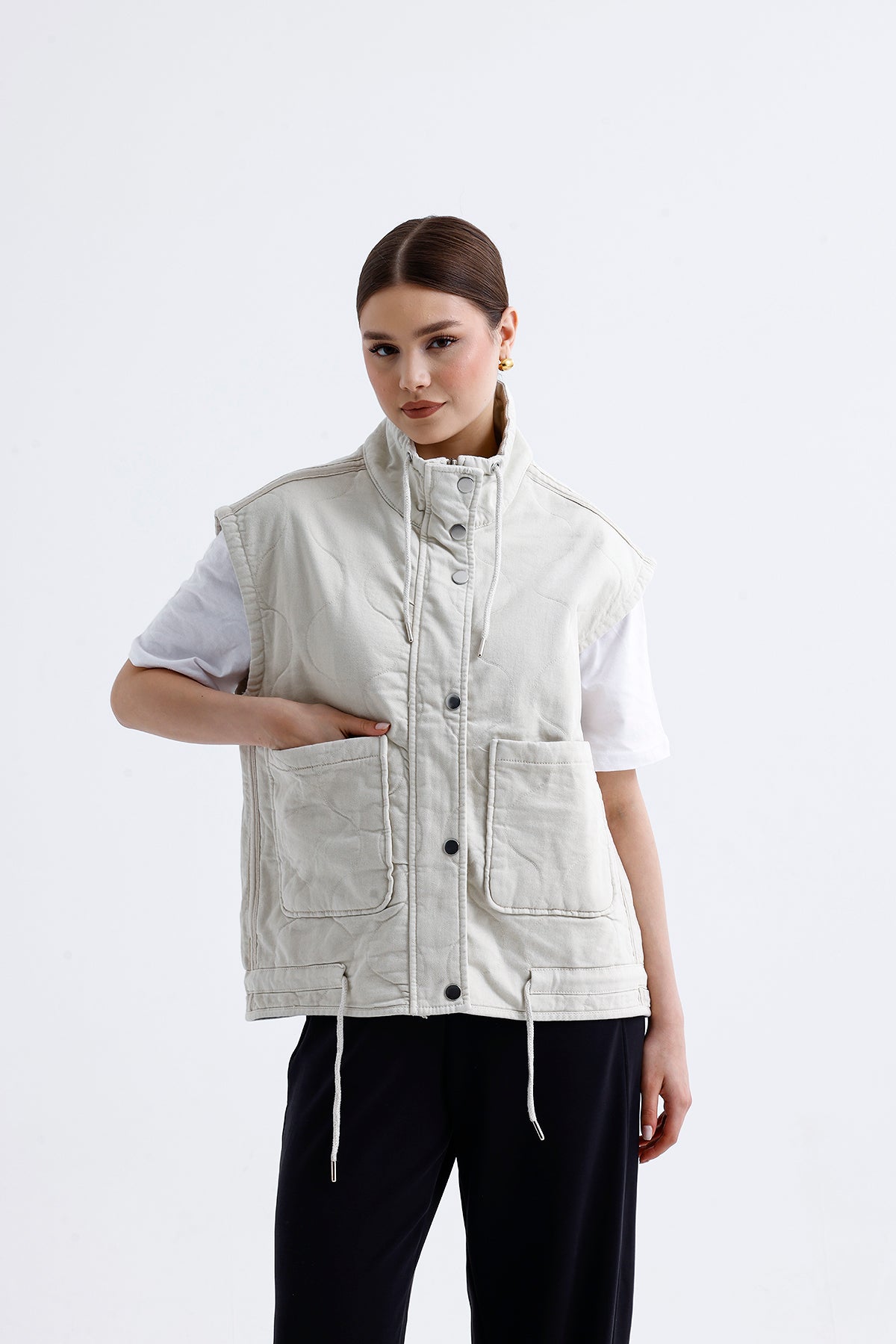 Modern ve sade görünümüyle dikkat çeken bu bej kadın kapitone yelek, hafif yapısıyla mevsim geçişlerinde konforlu bir kullanım sunar. Yumuşak dolgusu, dikiş detayları ve nötr tonu sayesinde hem spor hem şehir stiline kolayca uyum sağlar.