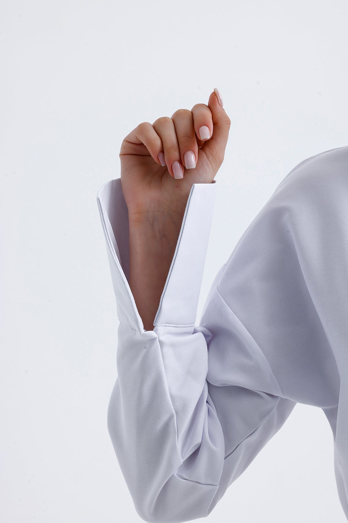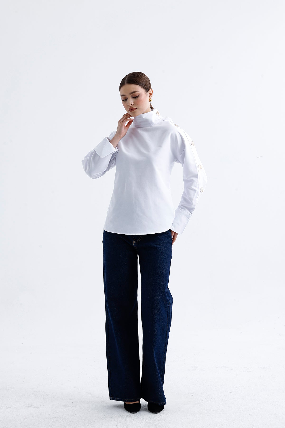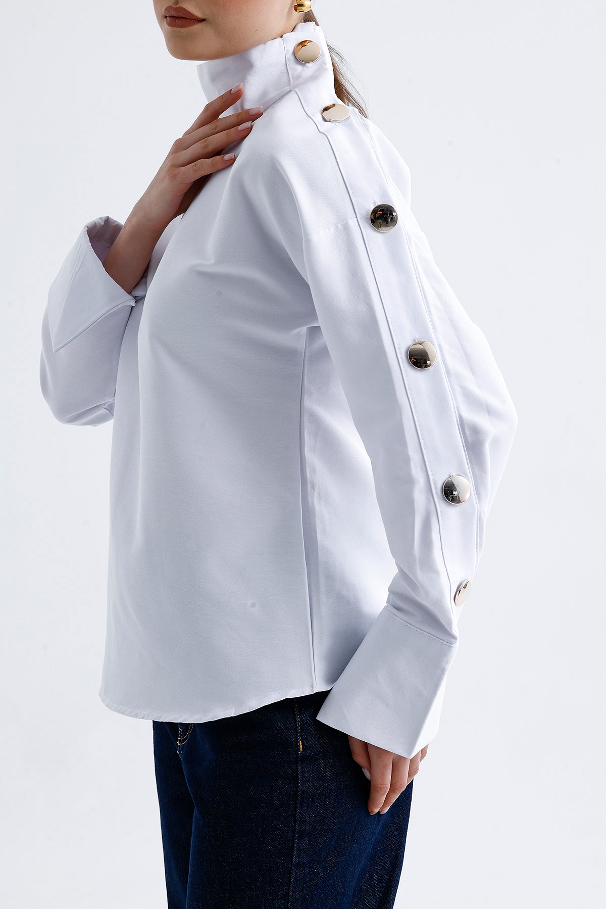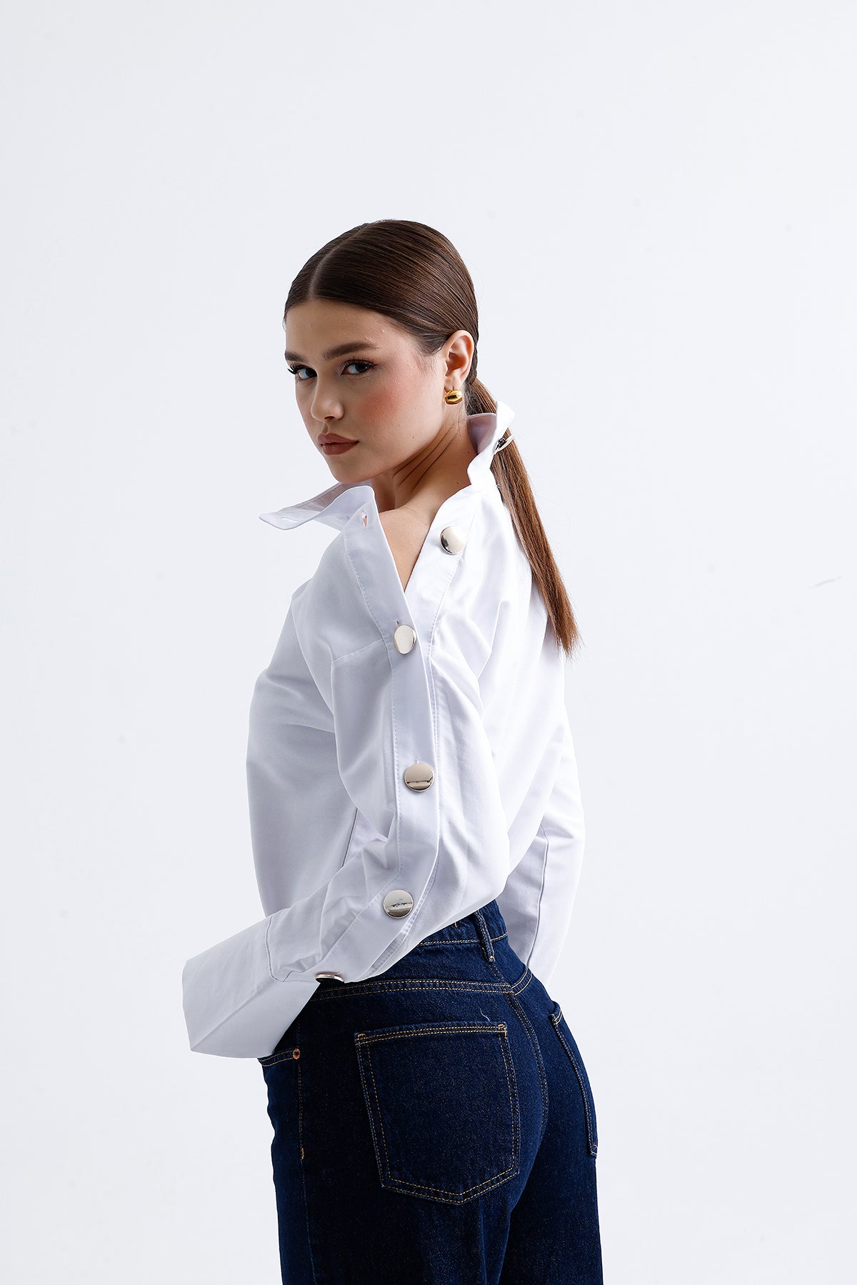 Klasik beyaz gömleğe modern bir dokunuş sunan bu model, omuz ve kol bölgesindeki düğme detaylarıyla dikkat çeker. Hem ofis hem günlük kullanım için ideal olan bu gömlek, sade şıklığı zarif ayrıntılarla tamamlar.