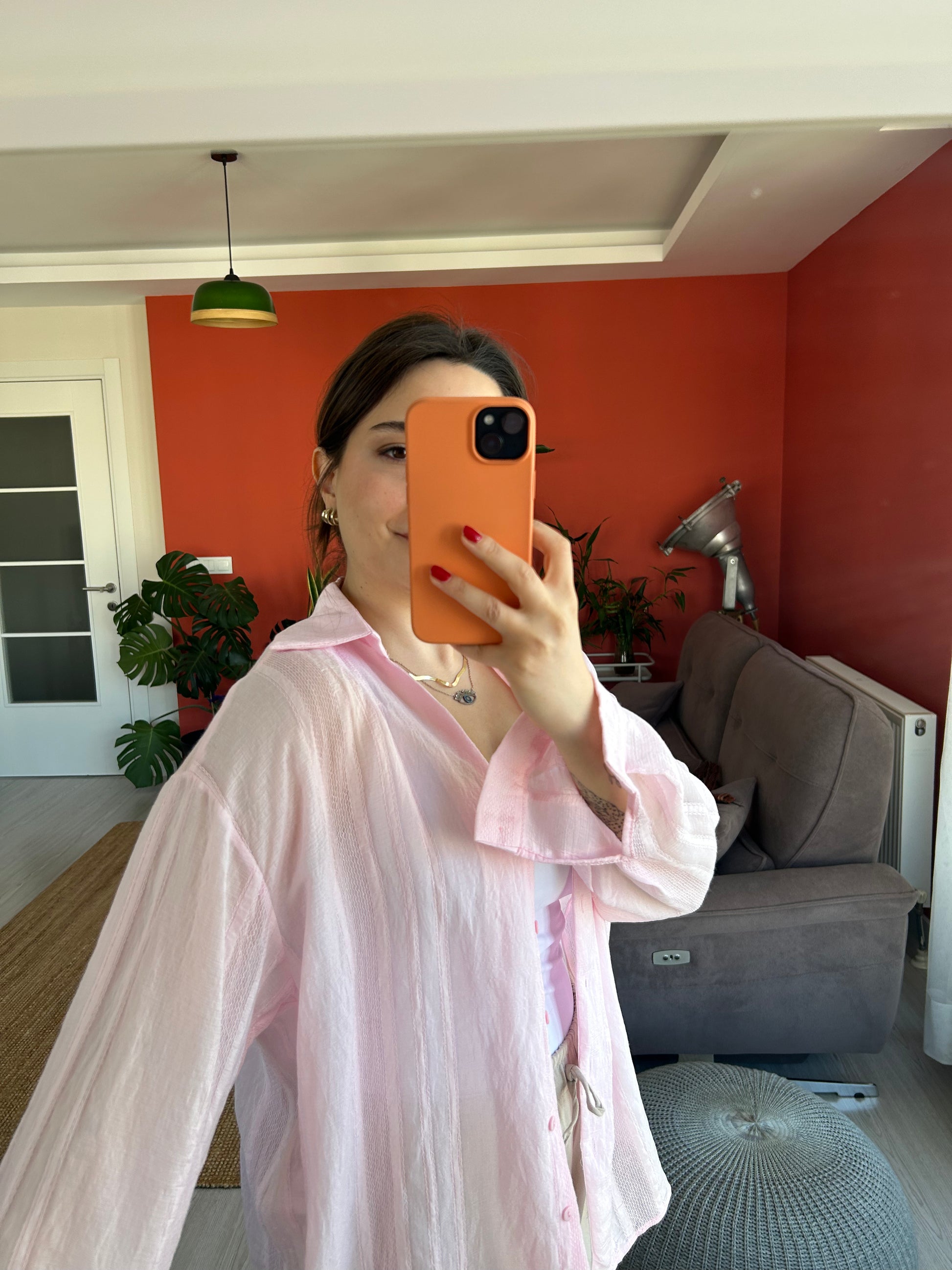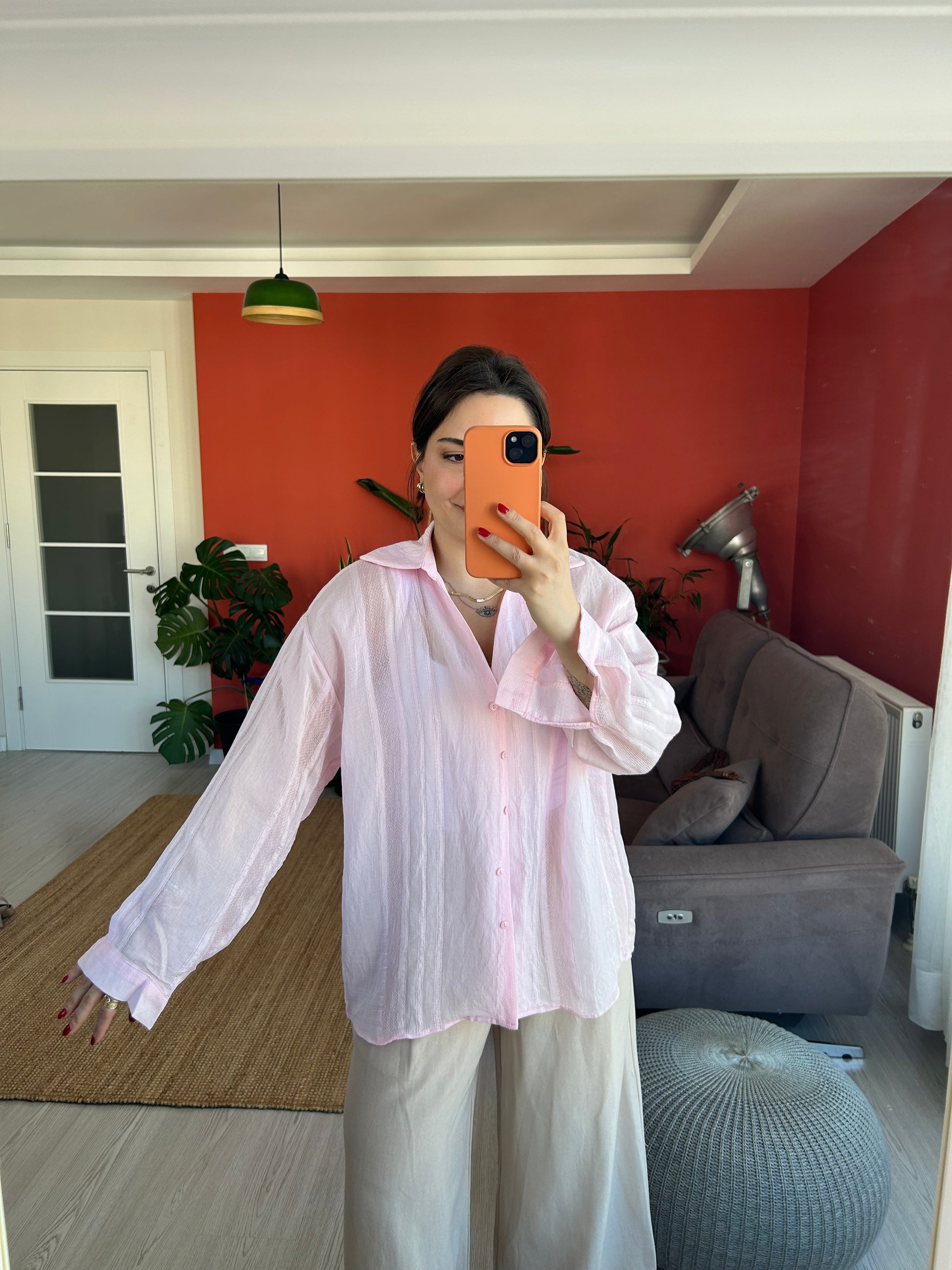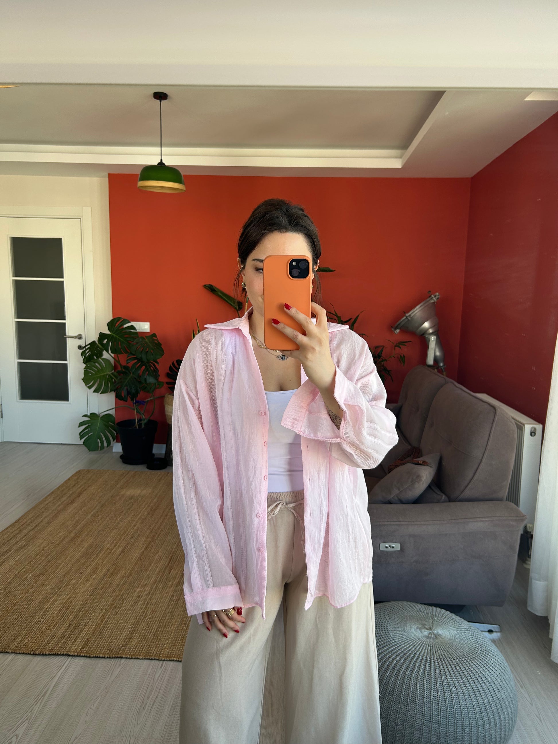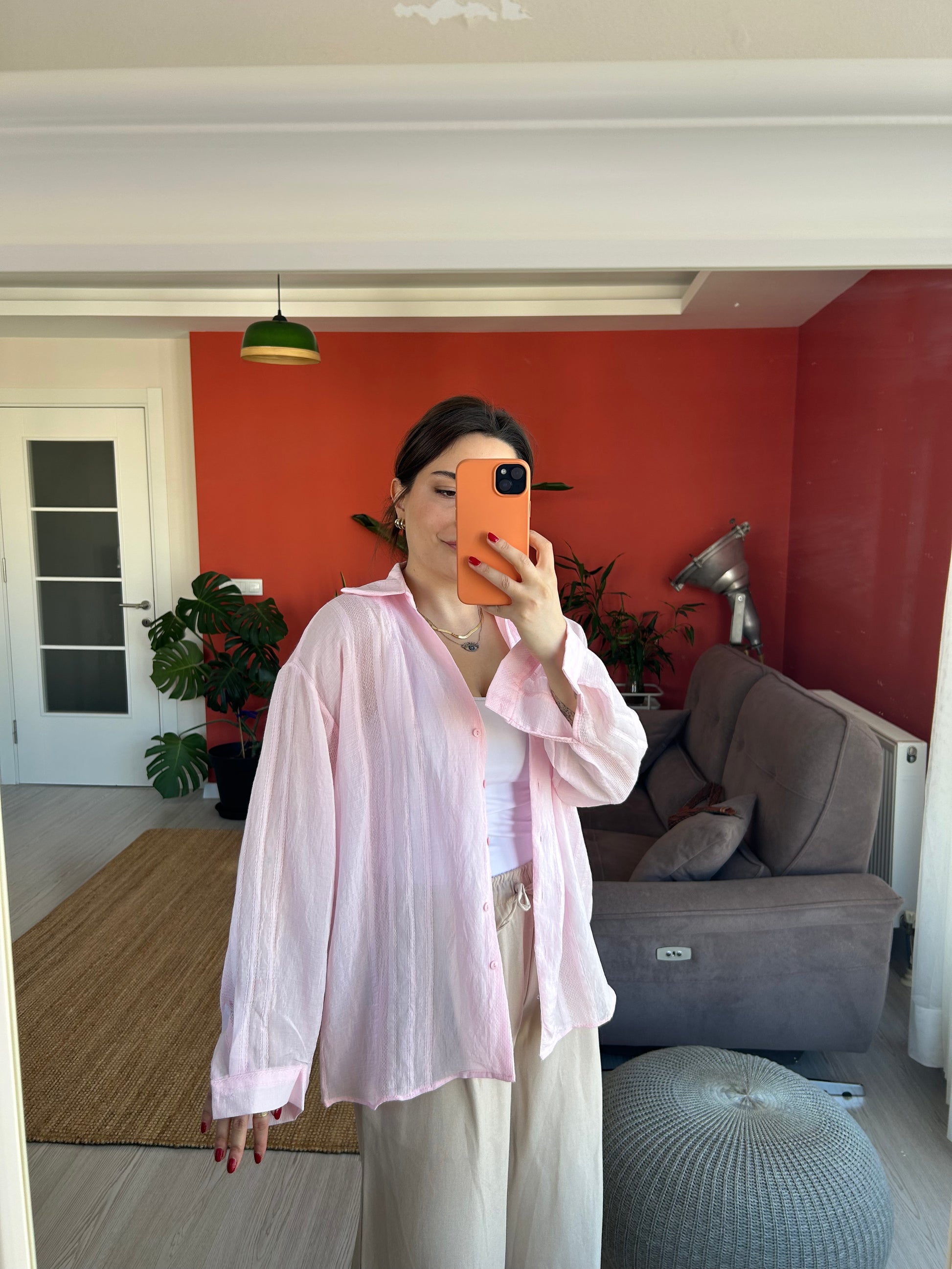 Kadın Gömlek – Pembe Transparan Kumaş Rahat ve Klasik Stil