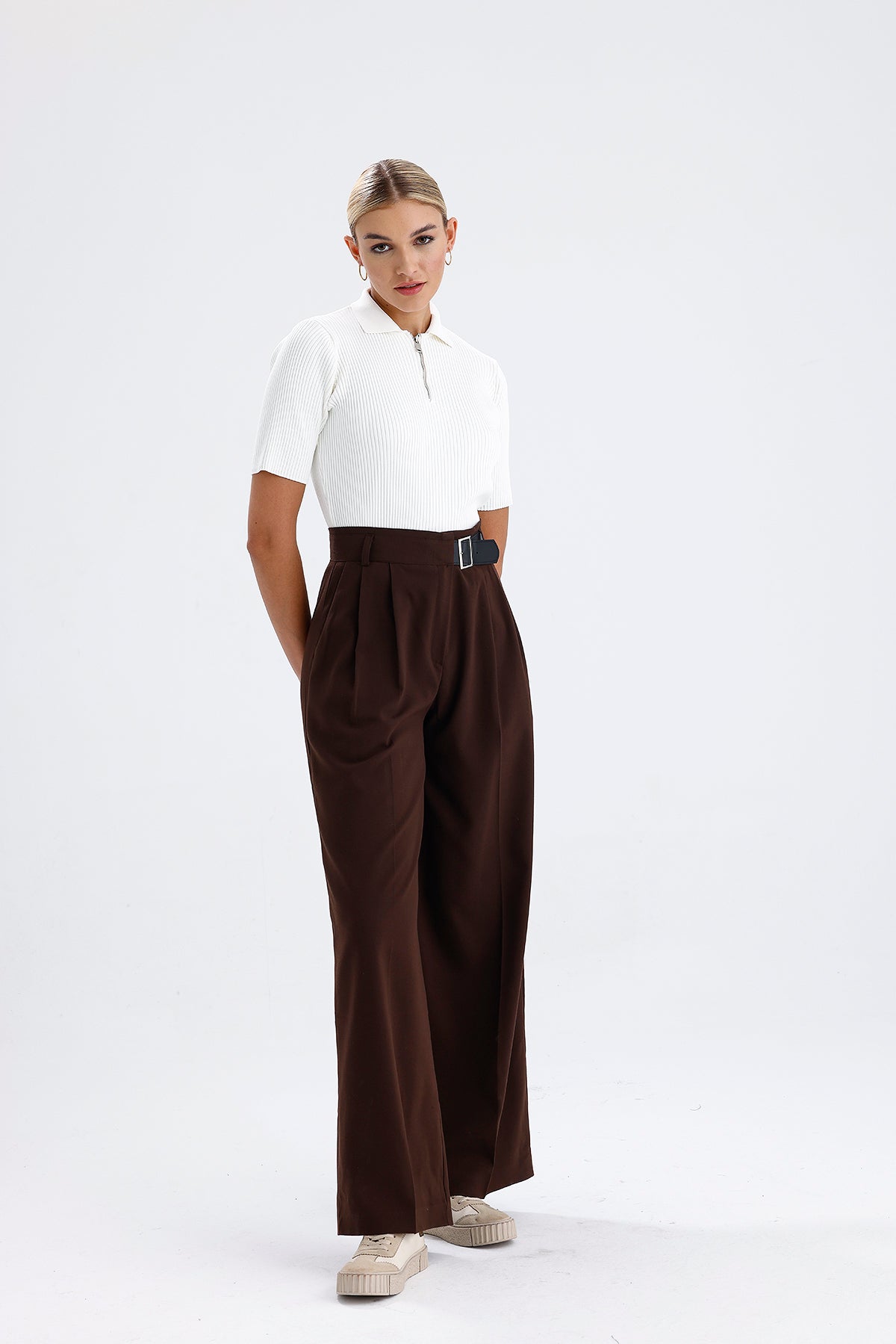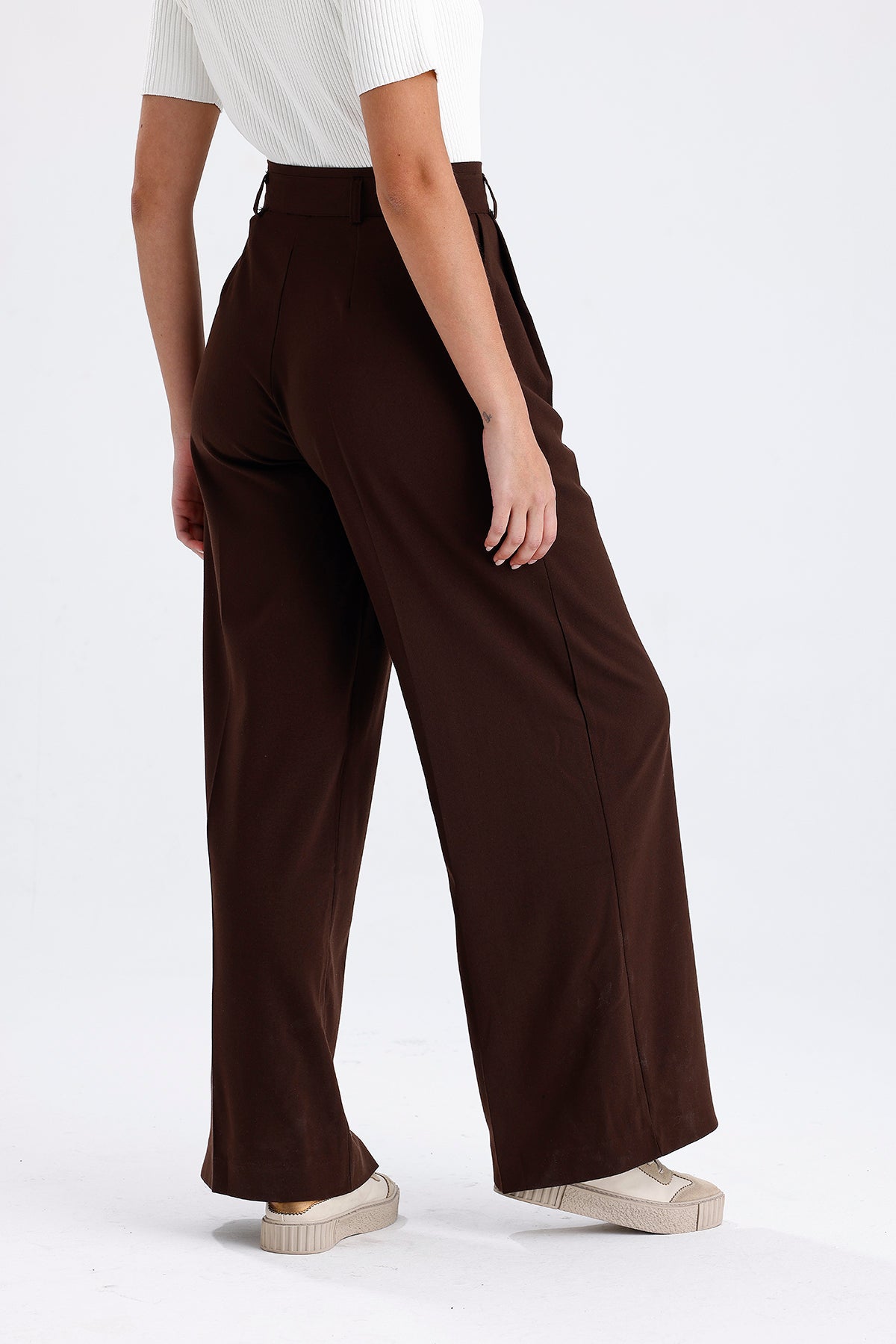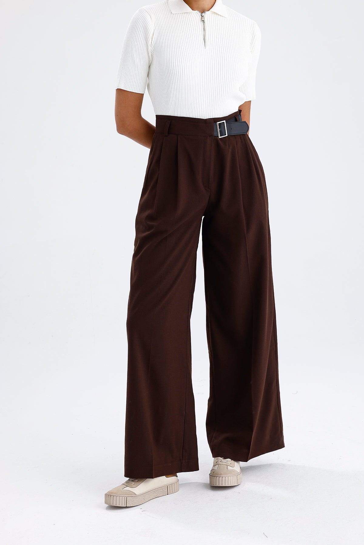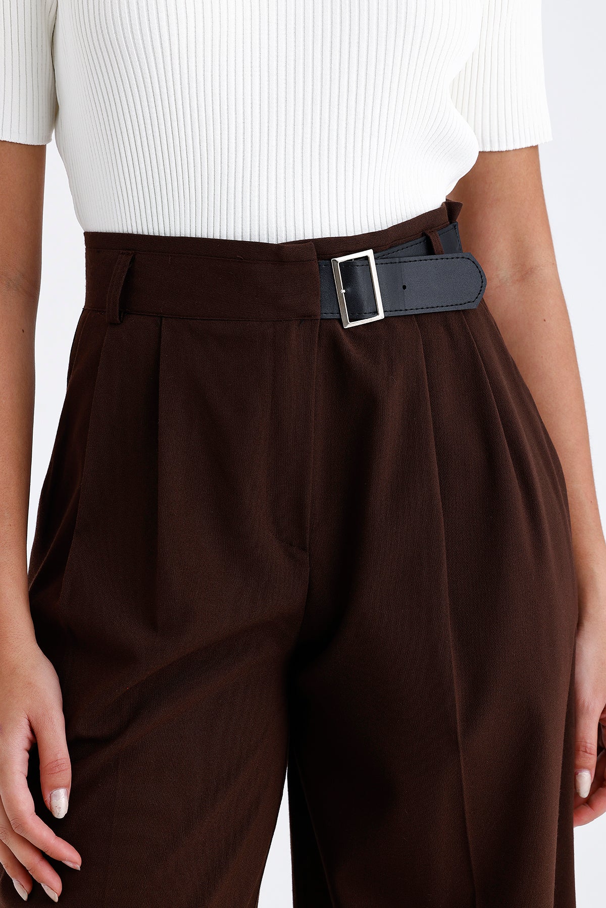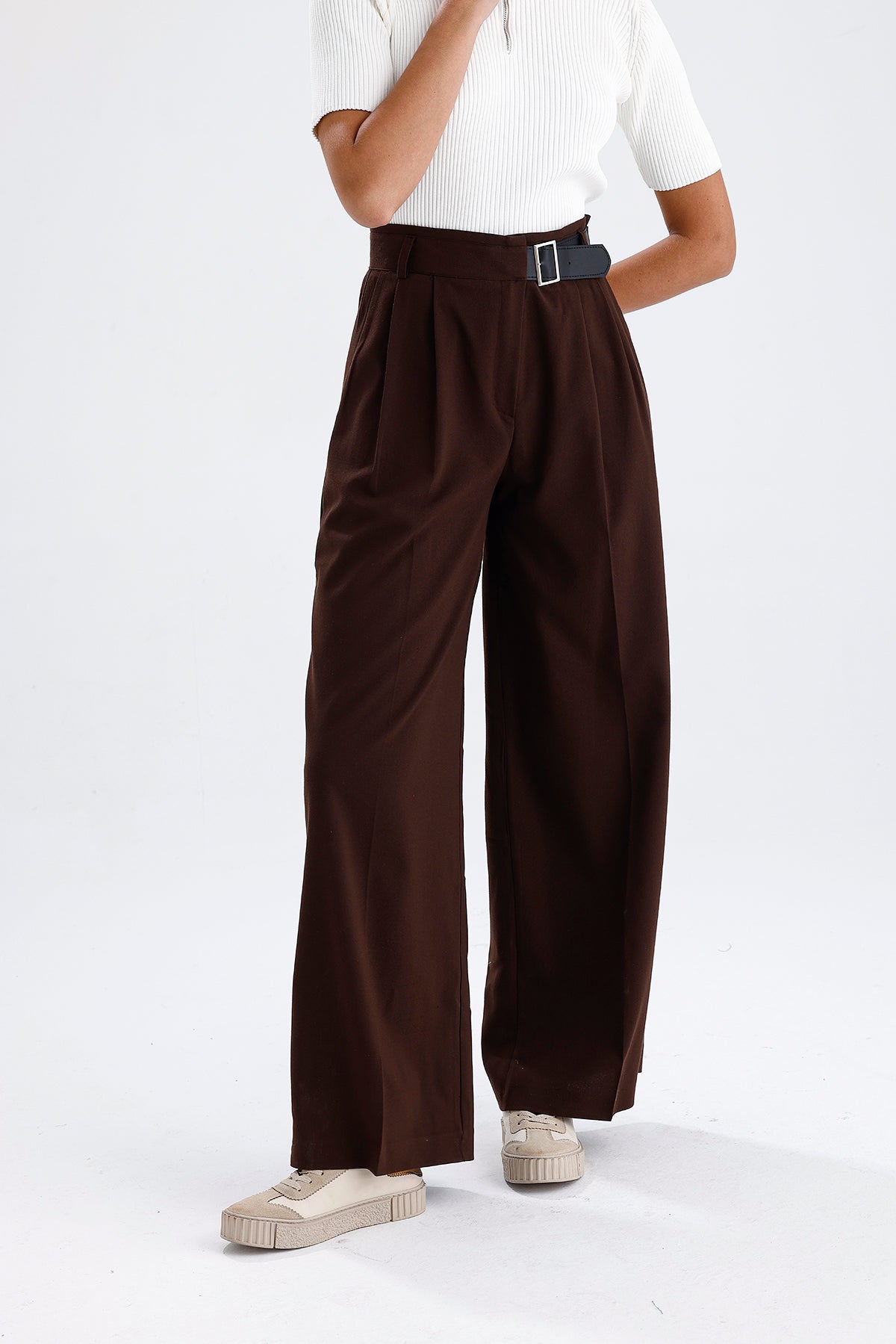 Kadın Kumaş Pantolon – Kahverengi Kemer Detaylı Modern Kesim