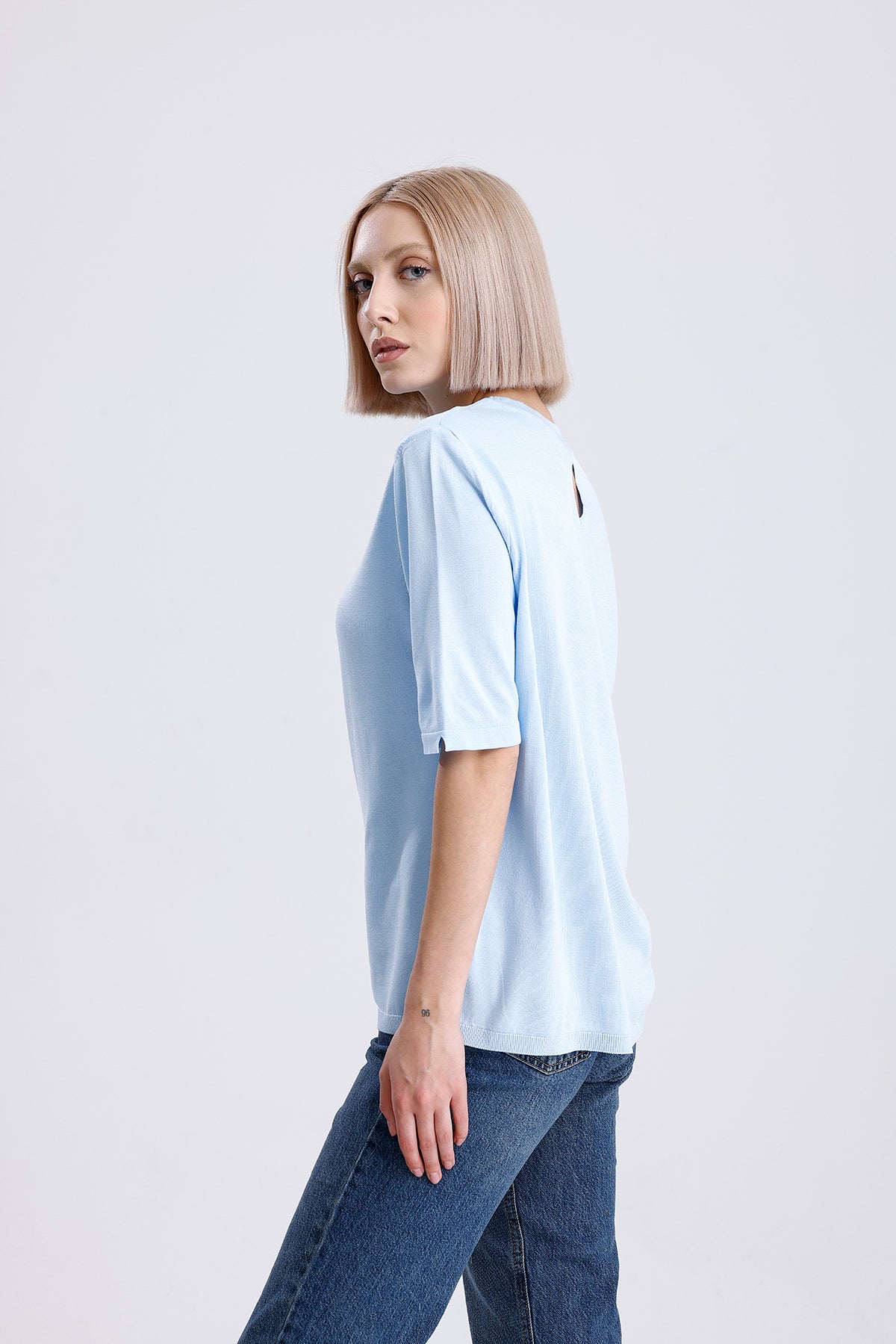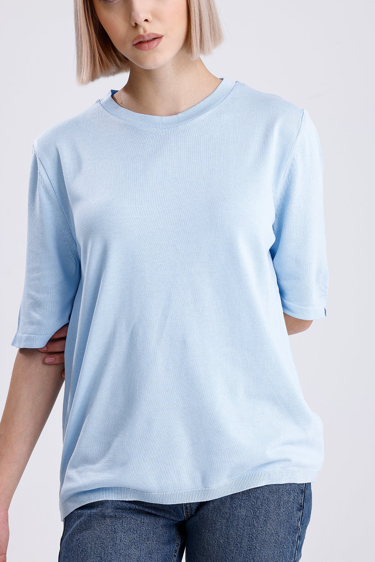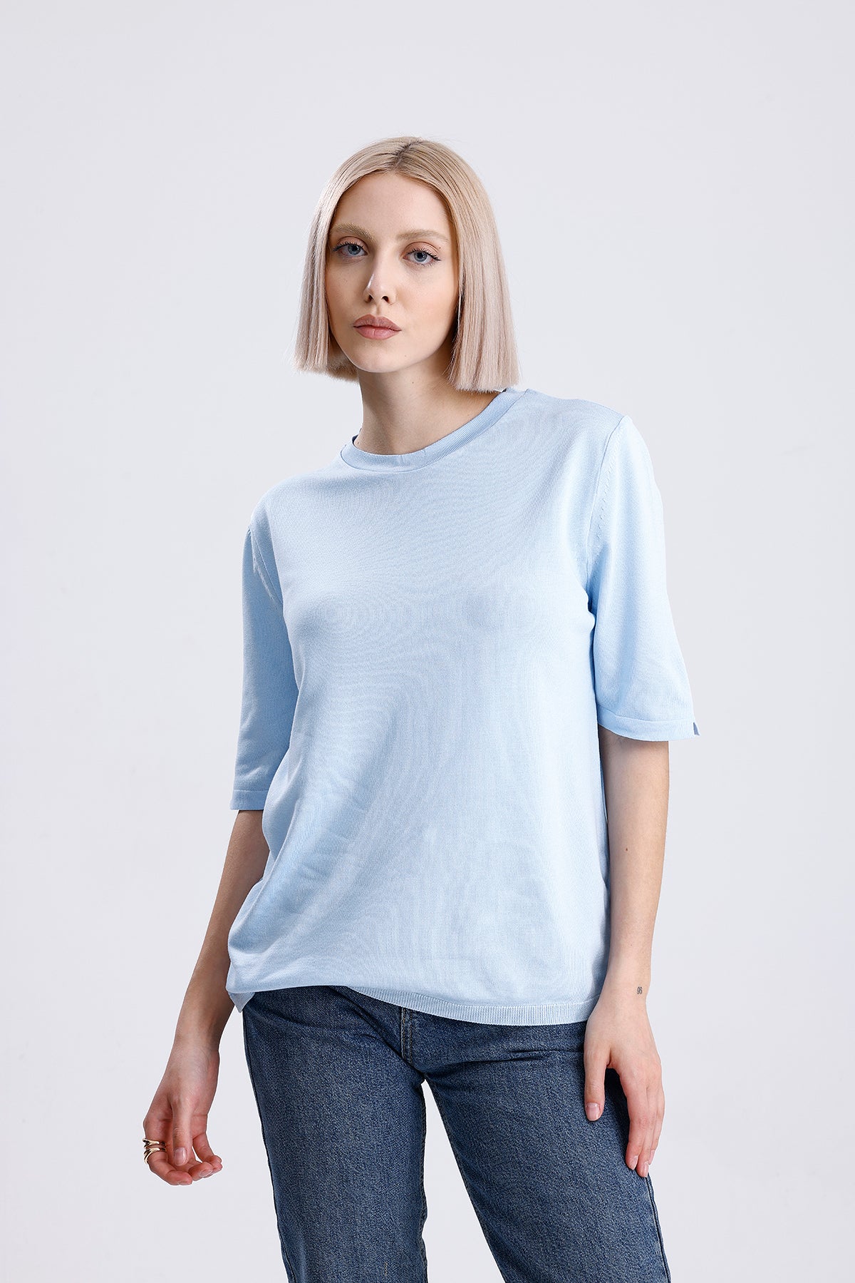 Kadın Triko Tişört – Mavi Yuvarlak Yaka Kısa Kollu Yazlık Üst