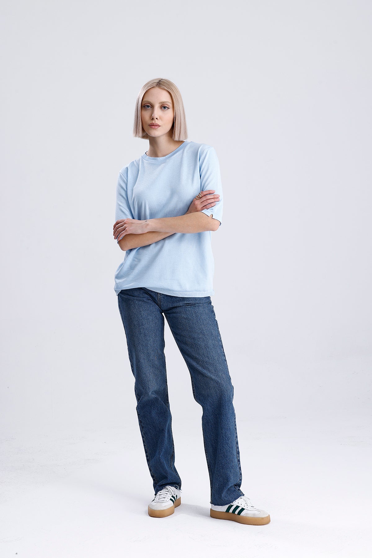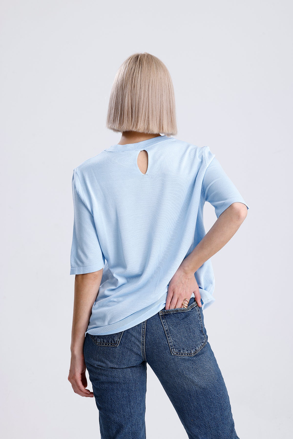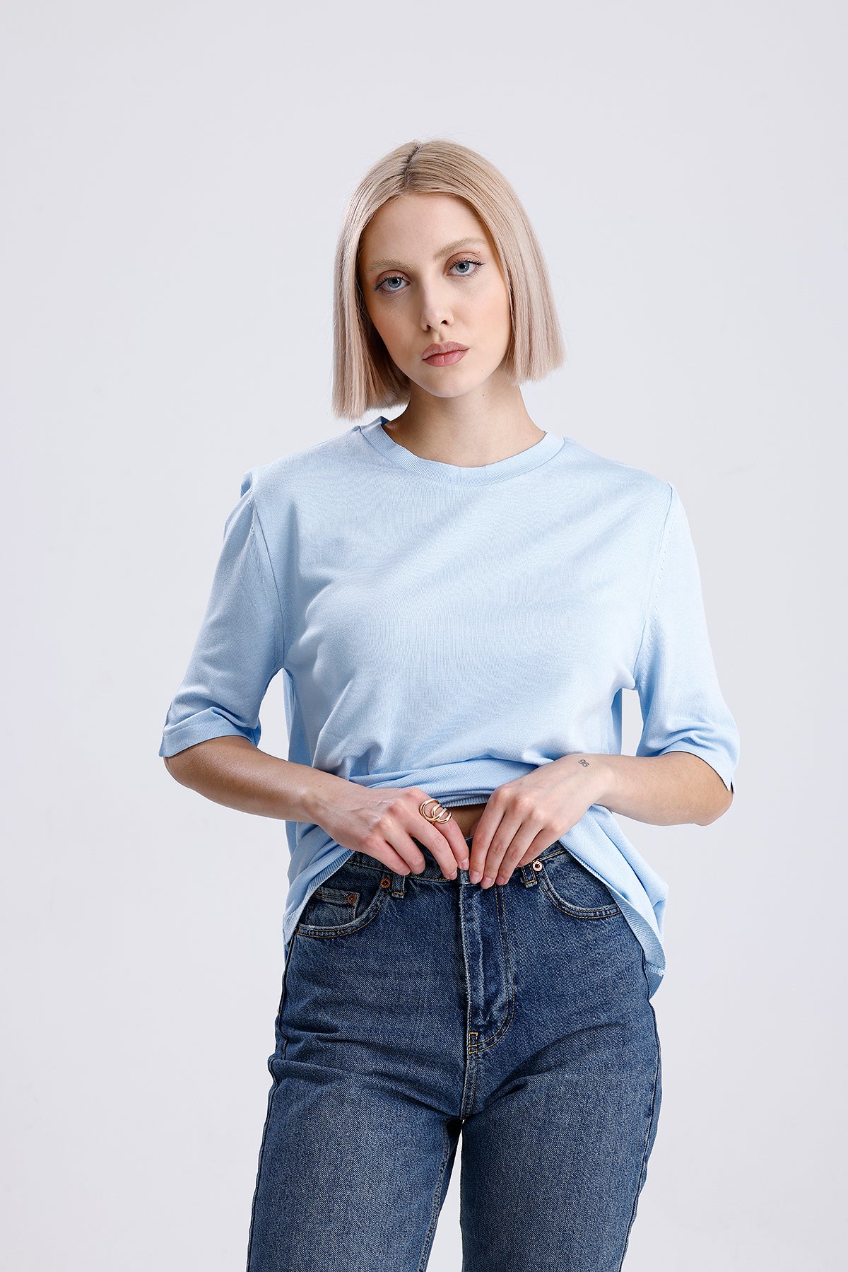 Kadın Triko Tişört – Mavi Yuvarlak Yaka Kısa Kollu Yazlık Üst