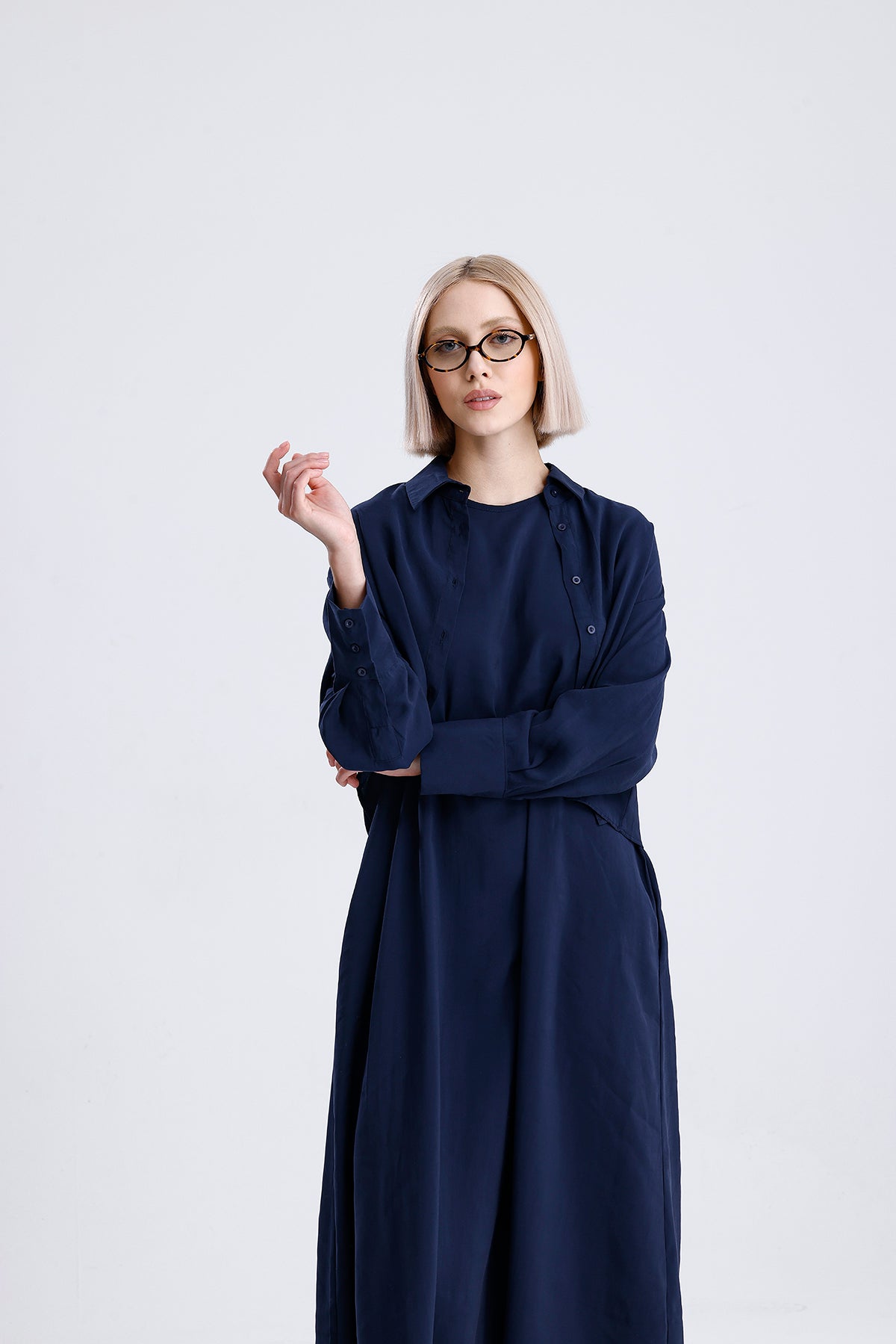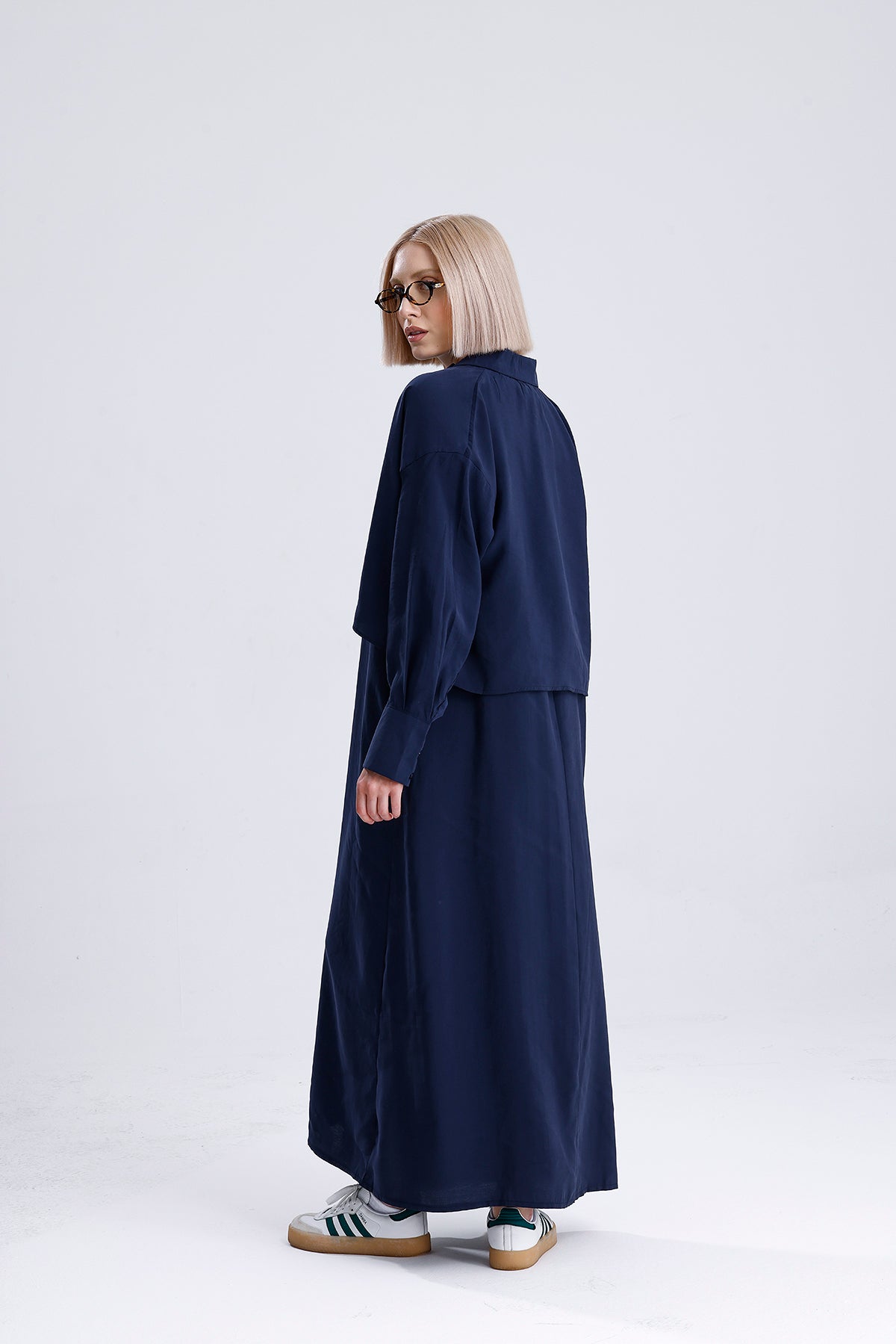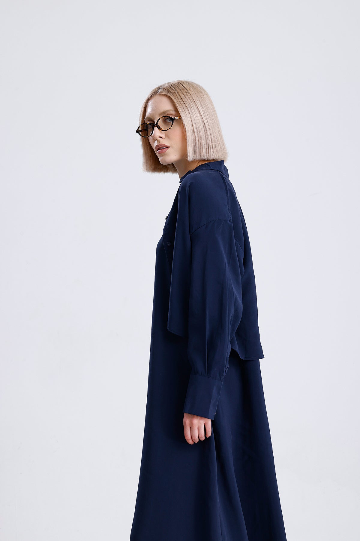 Modal kumaşın dökümlü ve hafif yapısıyla tasarlanan bu lacivert kadın takım, elbise ve gömlekten oluşan ikili yapısıyla modern bir şıklık sunar. Günlük stilinizi yükseltirken konfordan da ödün vermez; hem ayrı ayrı hem birlikte kombinlenebilir.