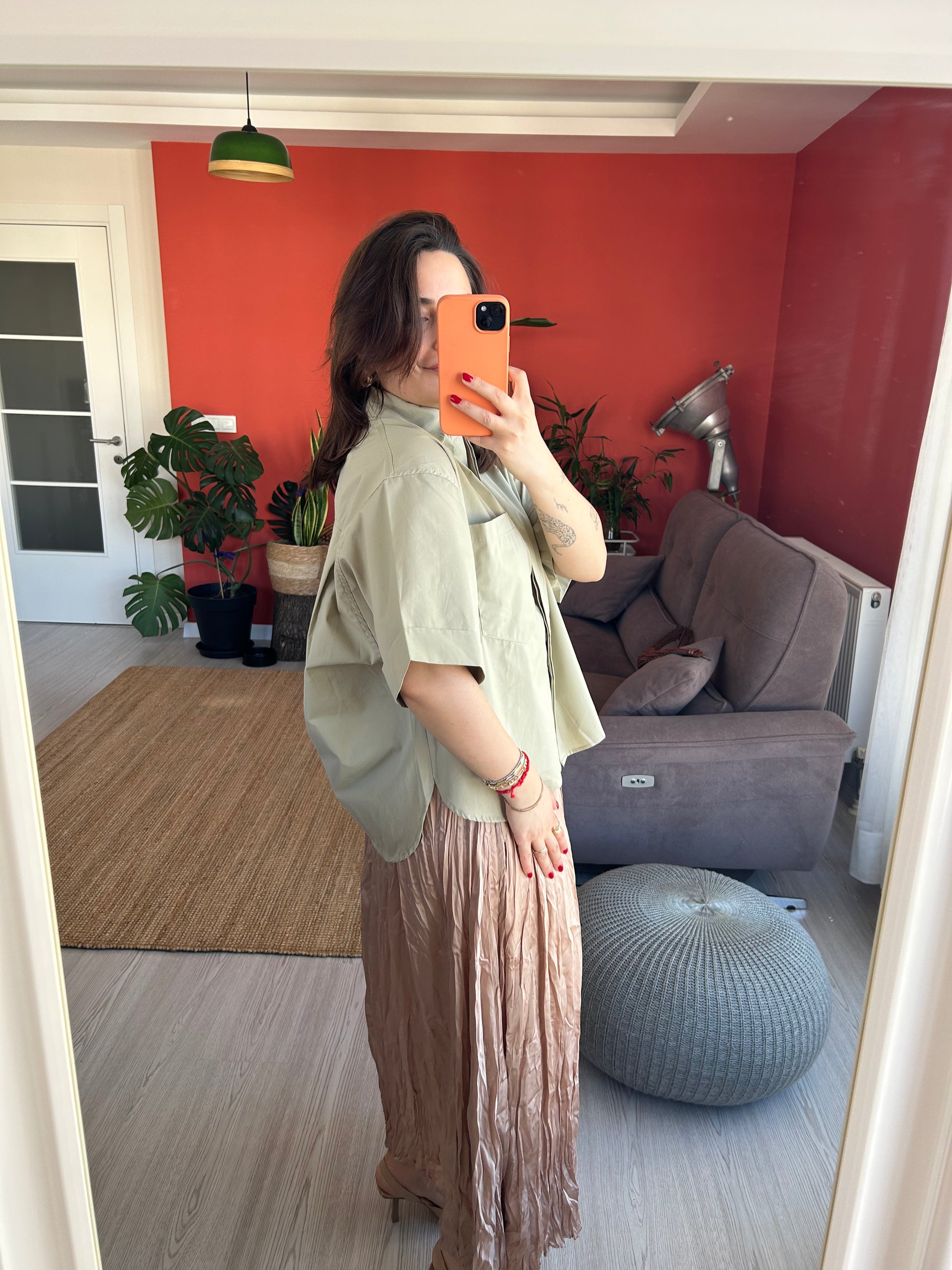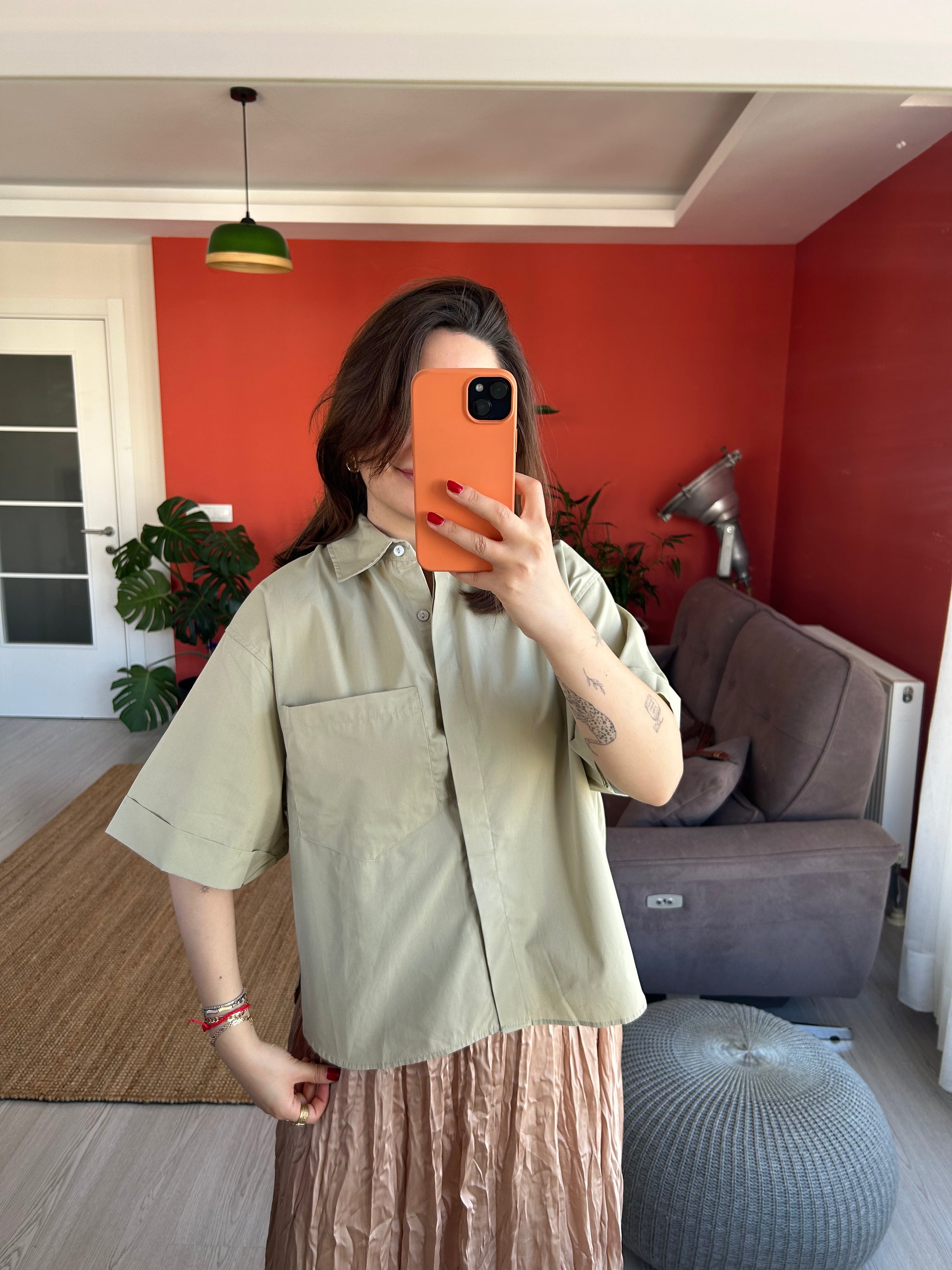 Kadın Poplin Gömlek – Haki Renk Kısa Kollu Klasik Stil
