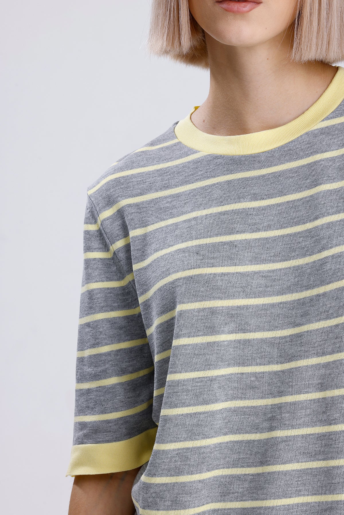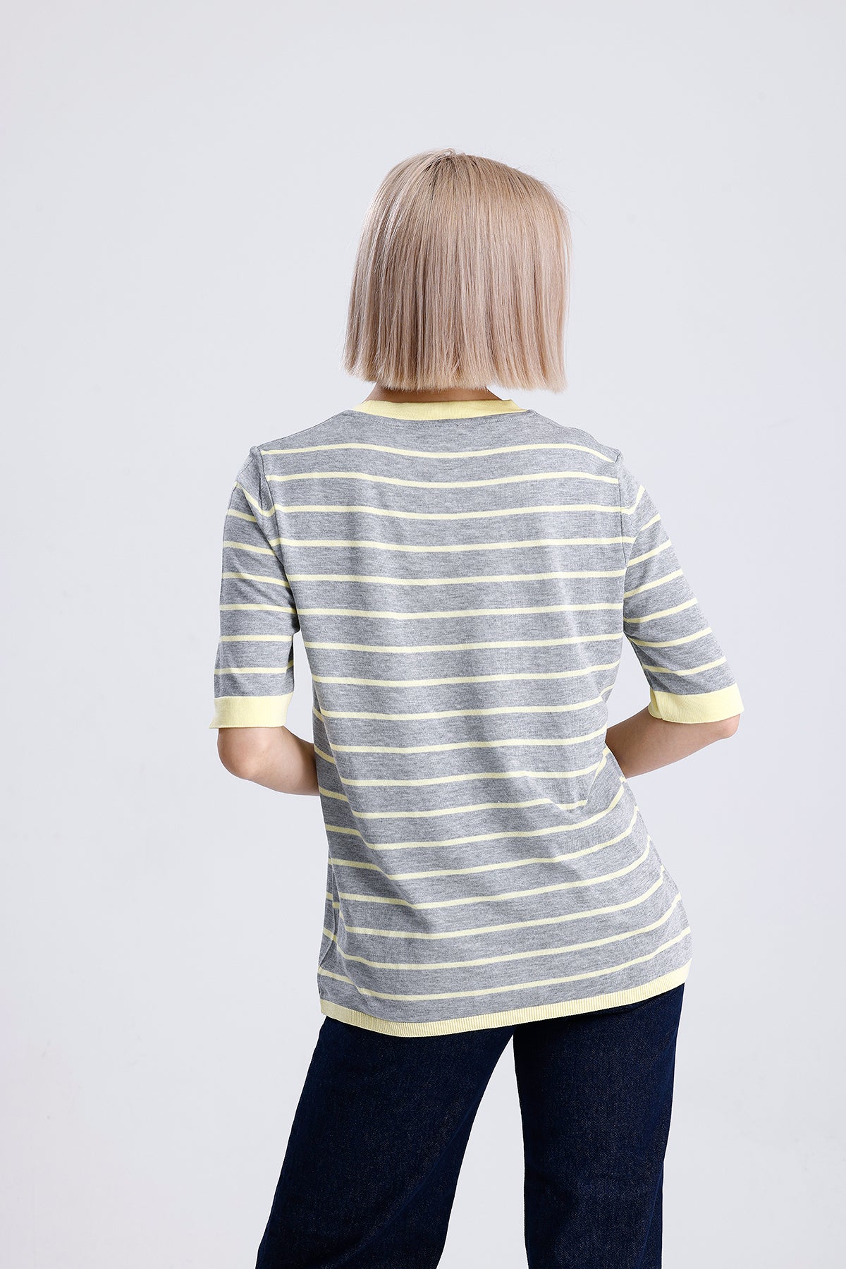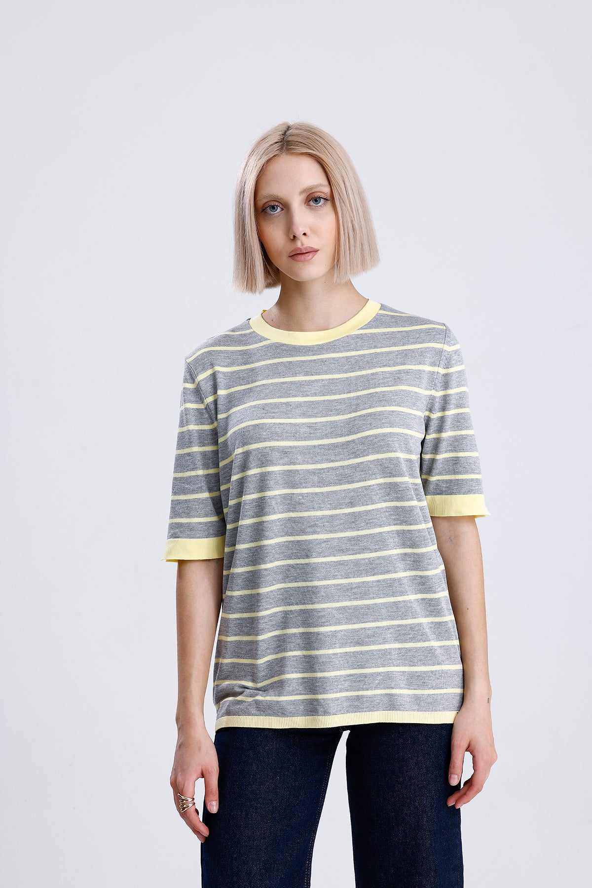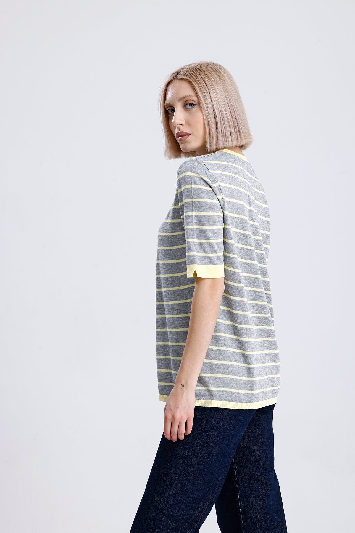 Kadın Triko Tişört – Sarı Çizgili Gri Renk Kısa Kollu Yuvarlak Yaka