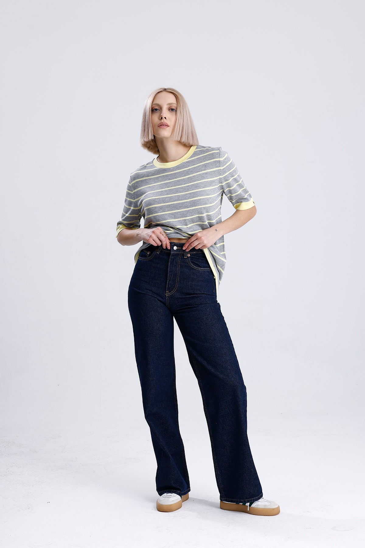 Rahat formu ve triko dokusuyla dikkat çeken bu kısa kollu kadın tişört, sarı çizgileriyle hareketli bir stil sunar. Hafif yapısıyla mevsim geçişlerinde idealdir; hem şık hem de konforludur.