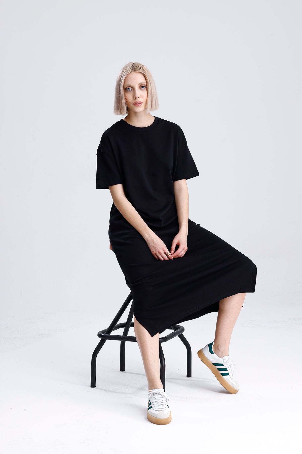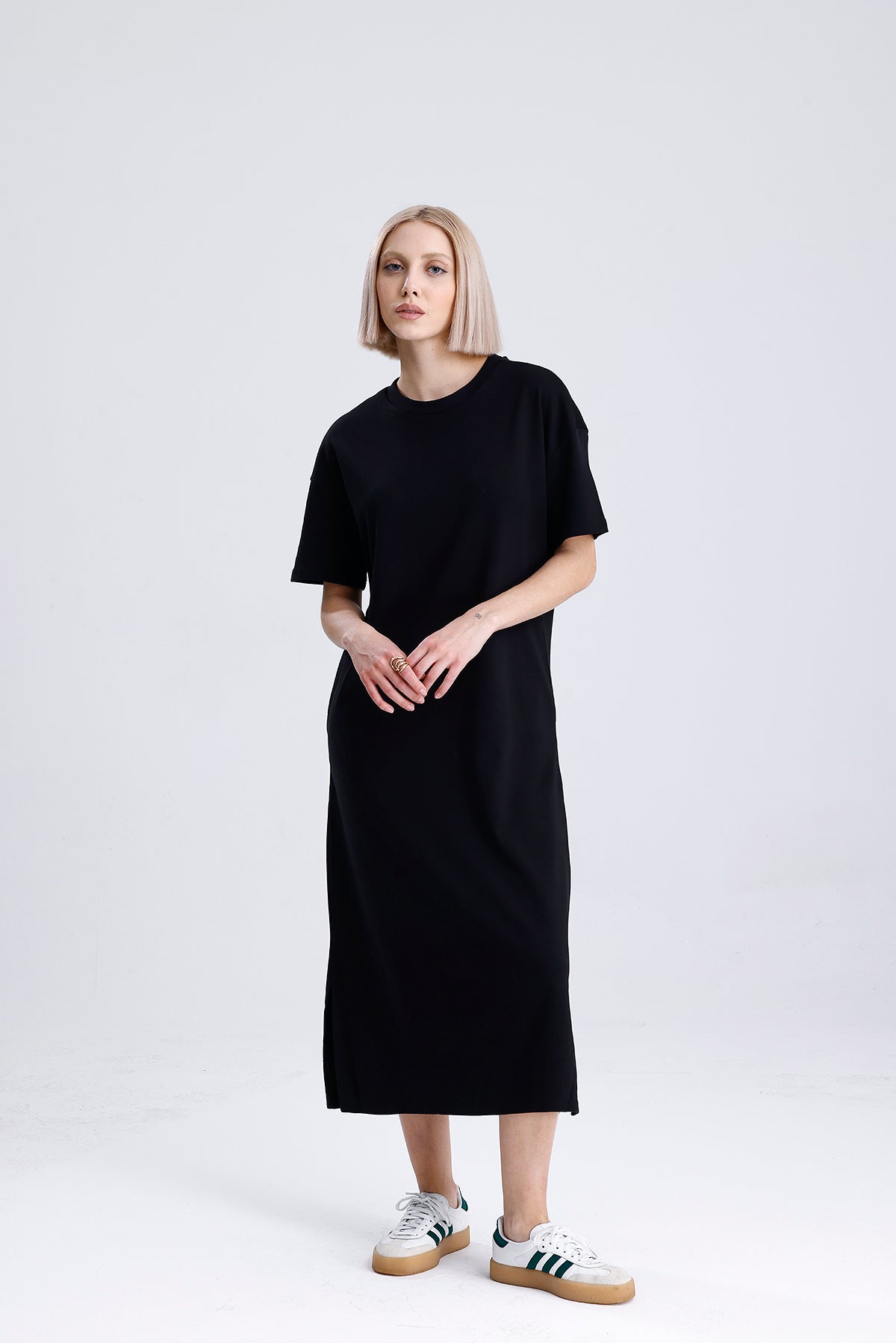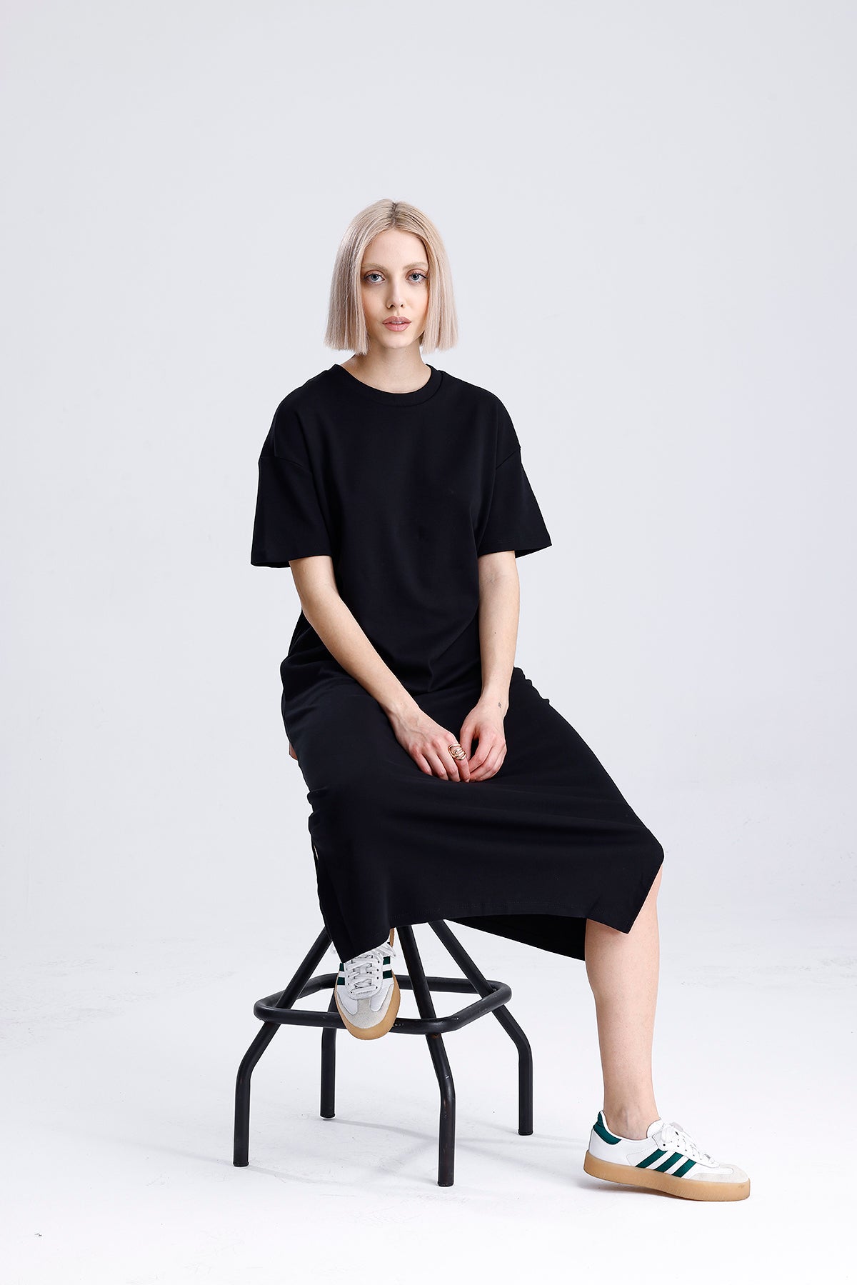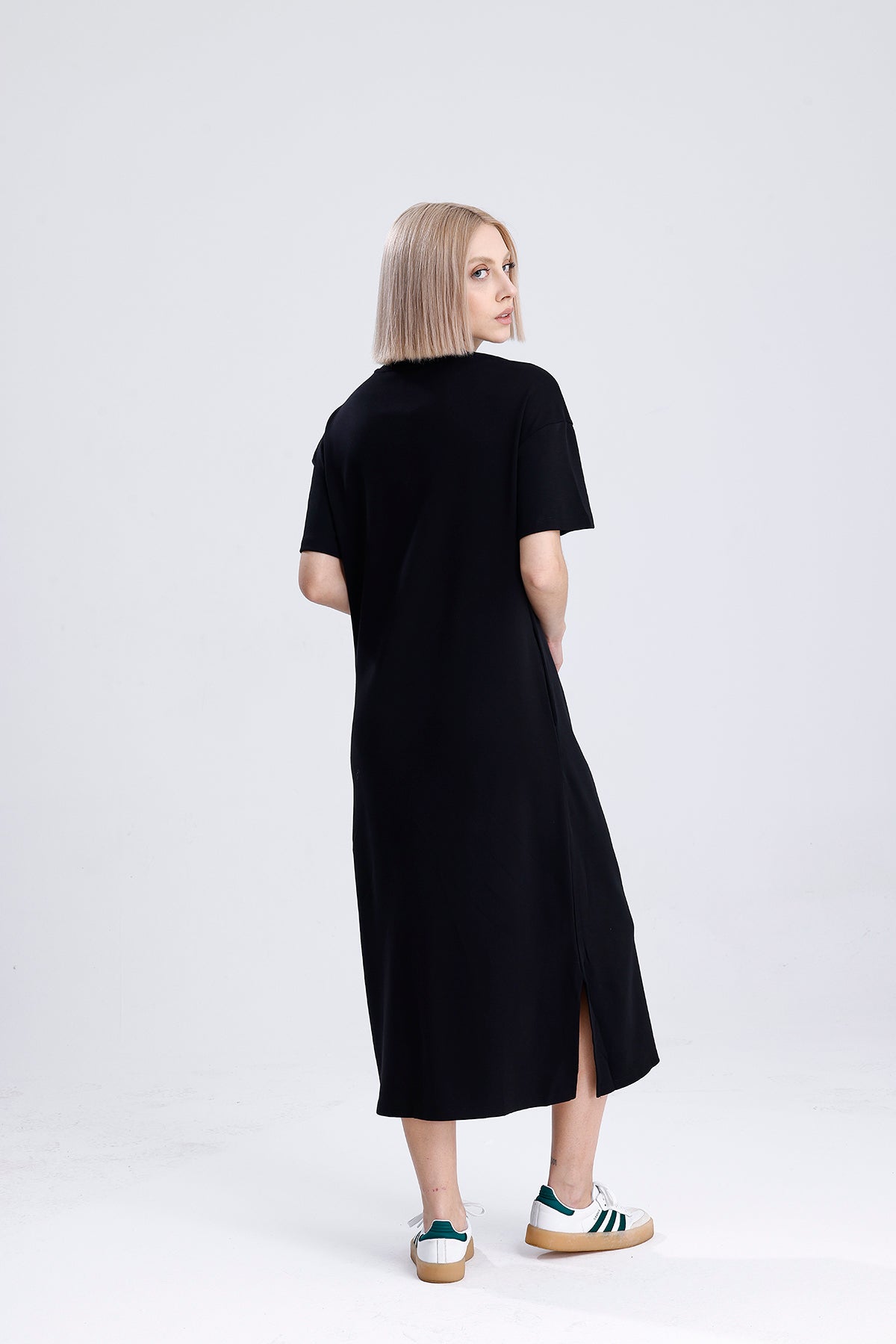 Şıklığın sadelikle buluştuğu bu siyah uzun pamuk elbise, kısa kollu tasarımıyla sıcak günler için mükemmel bir seçim. Hem şehir hayatında hem tatilde rahatlıkla kullanılır, dolabınızın en kurtarıcı parçalarından biri olur.