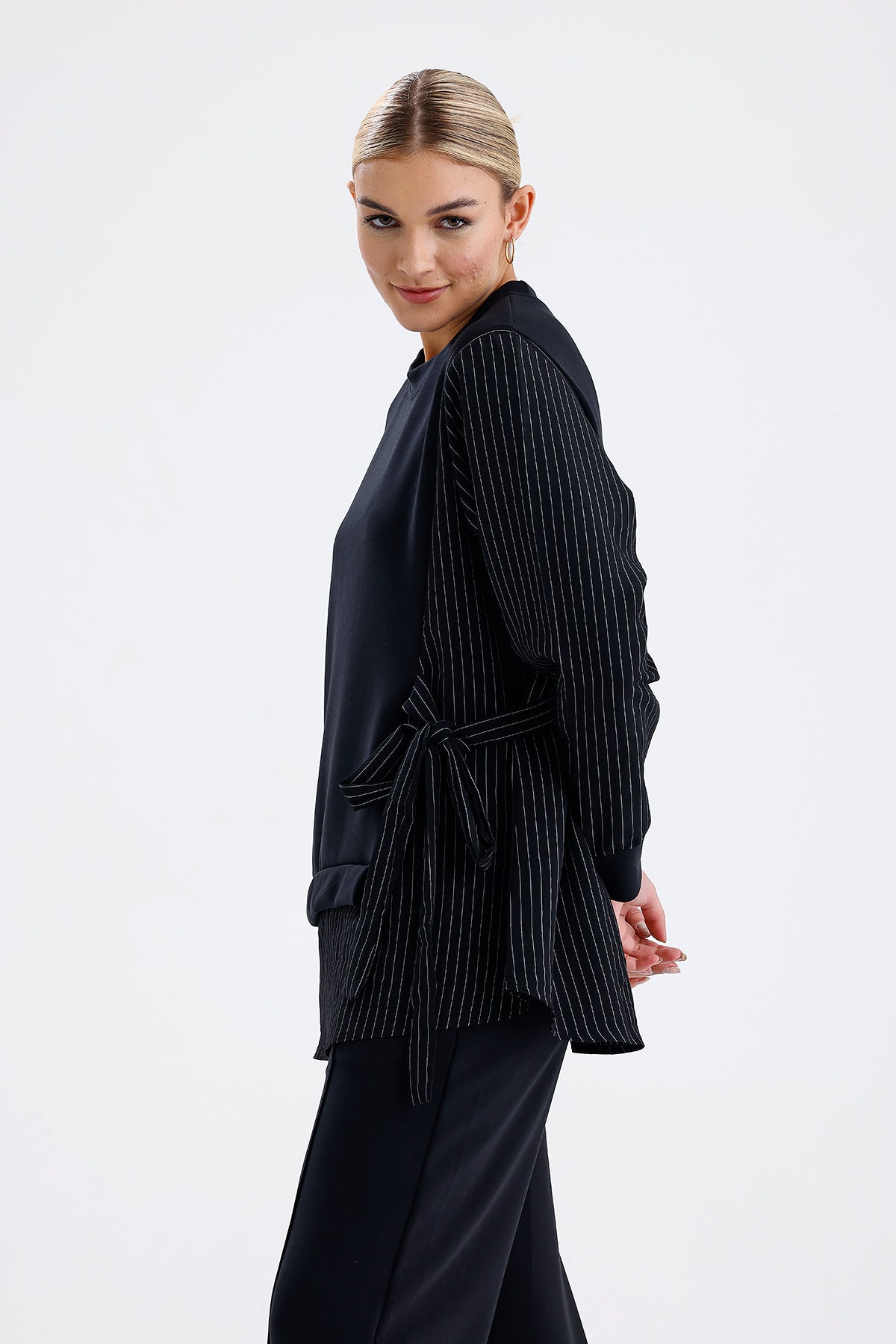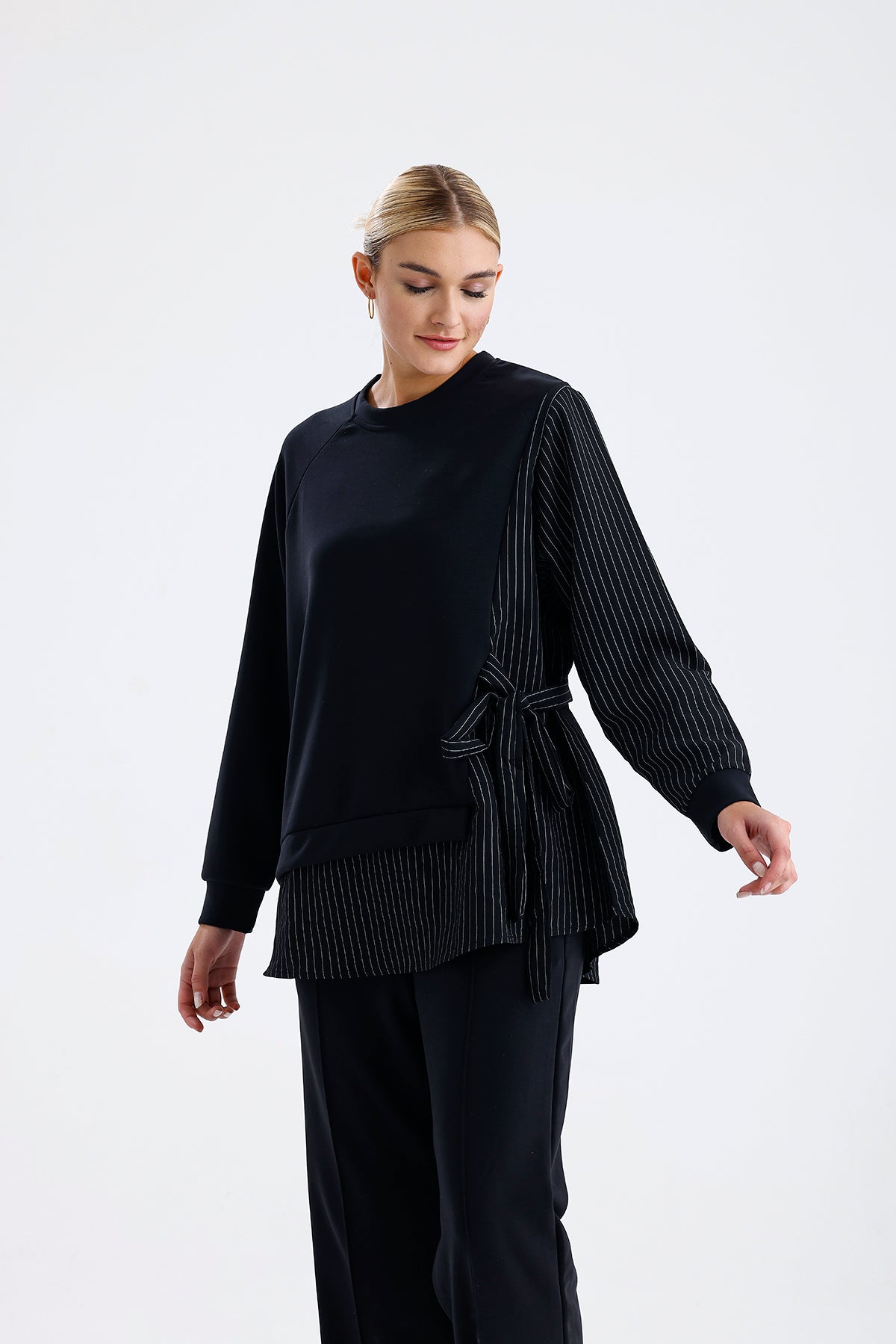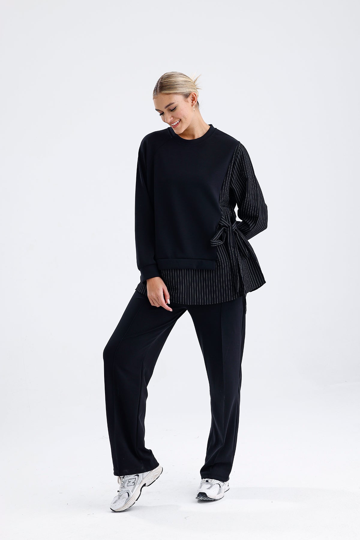 Yumuşak modal kumaşı ve zarif bağlama detayıyla dikkat çeken bu siyah kadın takım, dökümlü formu sayesinde gün boyu konfor sağlar. Modern kesimiyle ofis, şehir ya da özel gün kombinlerinde hem sade hem şık bir görünüm sunar.
