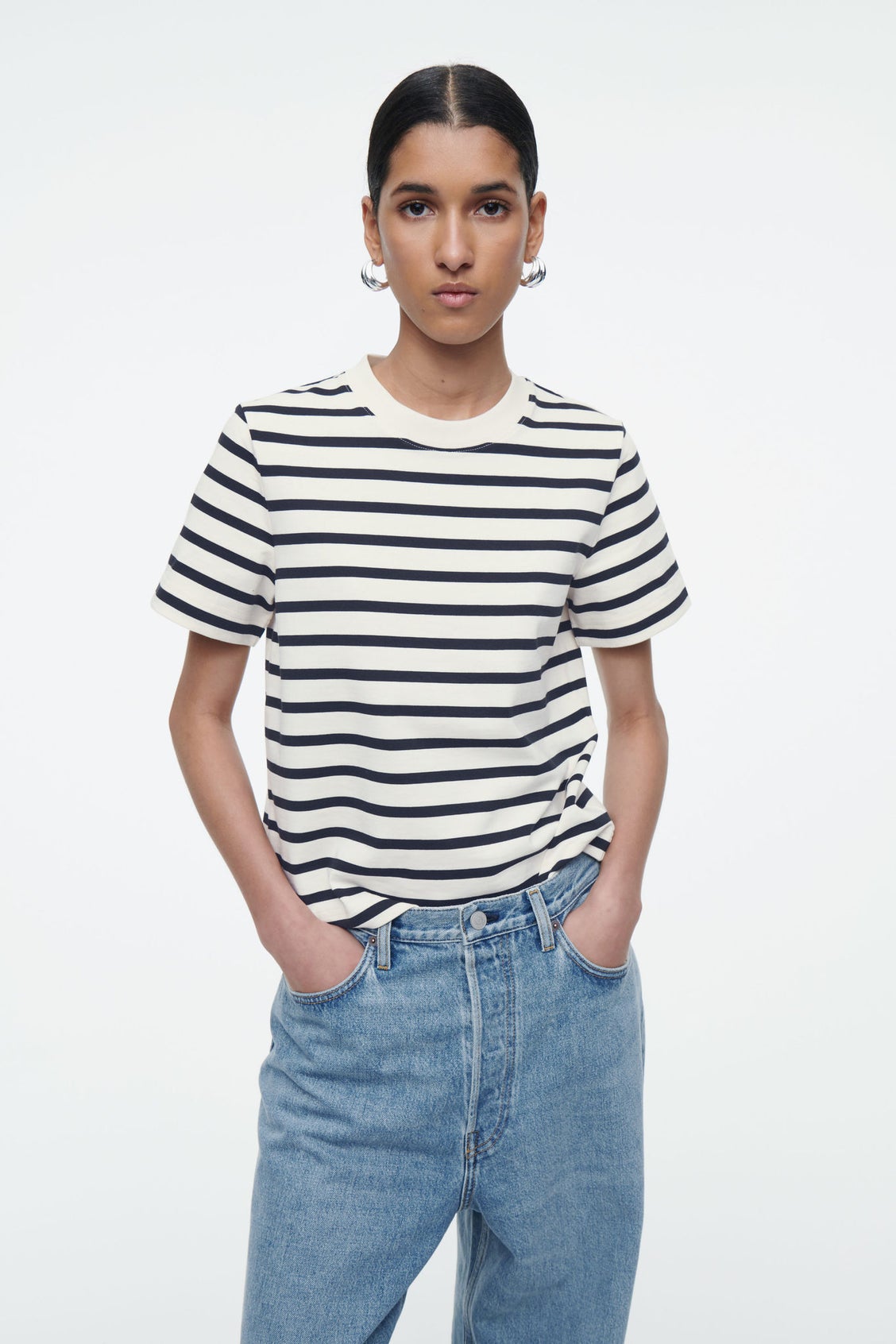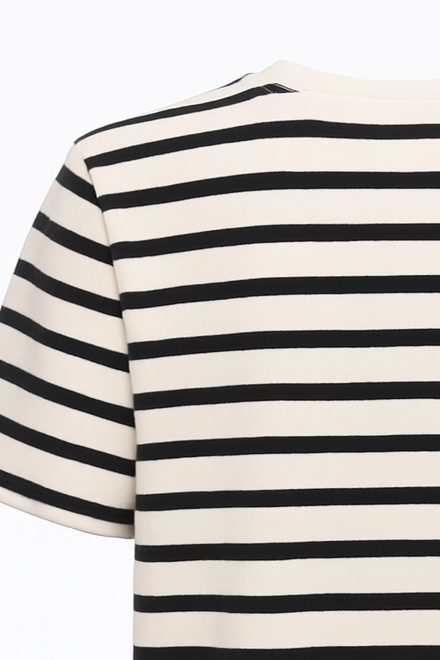 Doğal pamuk kumaşıyla gün boyu ferahlık sunan bu kadın çizgili tişört, rahat kesimiyle konforu, zarif tasarımıyla da şıklığı bir araya getiriyor. Hem şehir hayatı hem hafta sonu stili için ideal bir seçim.